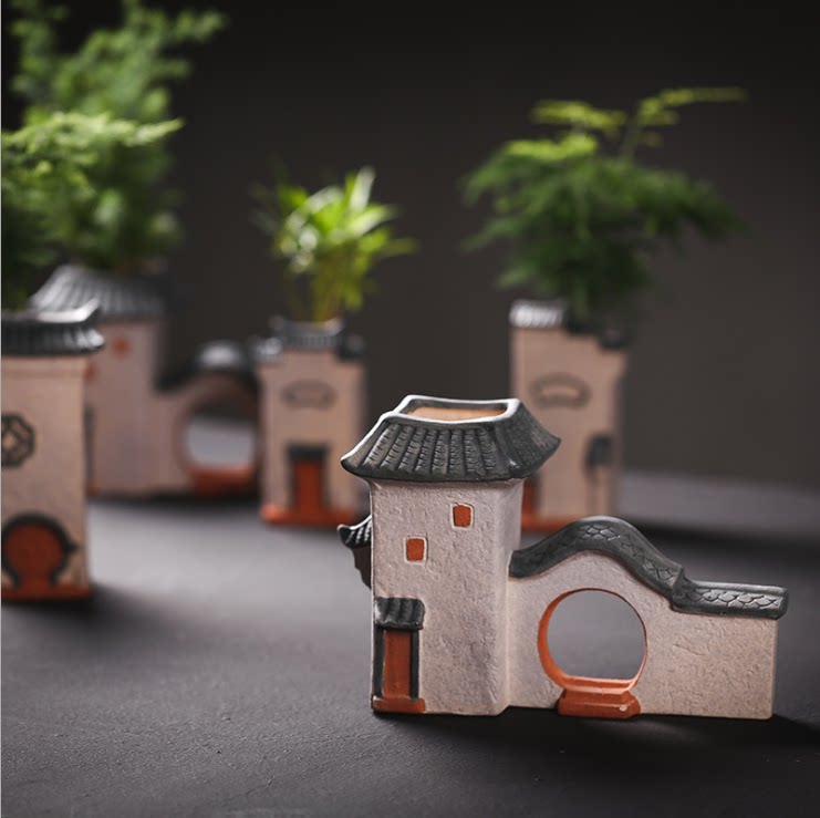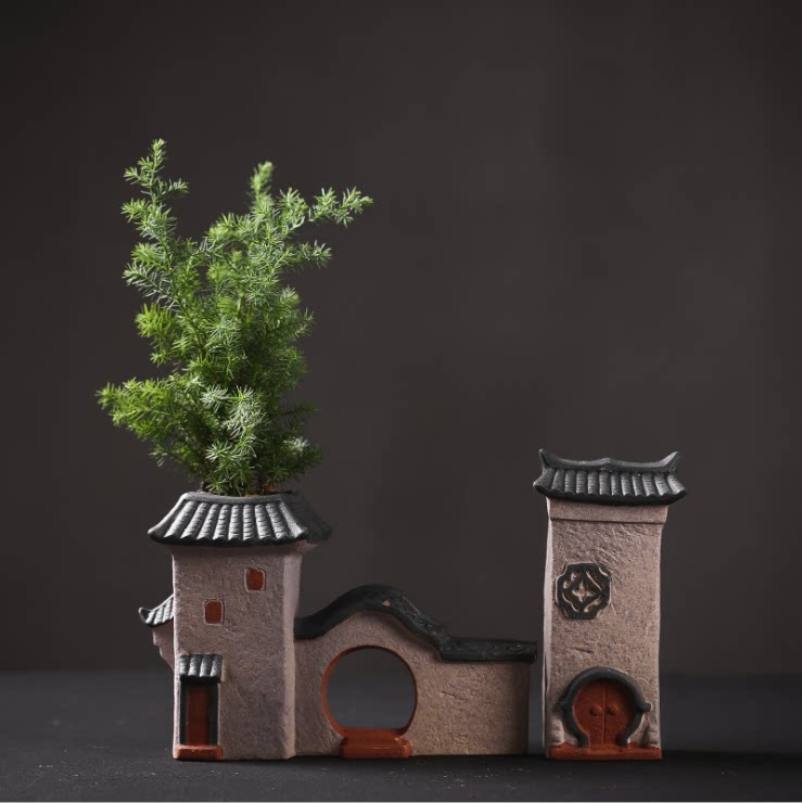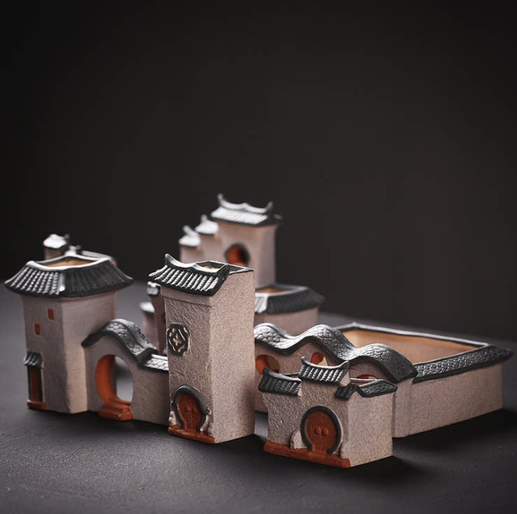 Jiangnan people's house Coarse pottery flower pot Flower pot Chinese style Hui School architecture Wenzhu micro landscape bonsai accessories