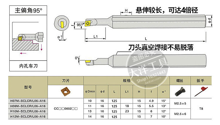 High-speed steel seismic resistance Direction inner hole knife bar 95 degrees boring diamond shape H08K H10K-SCLCR06 03