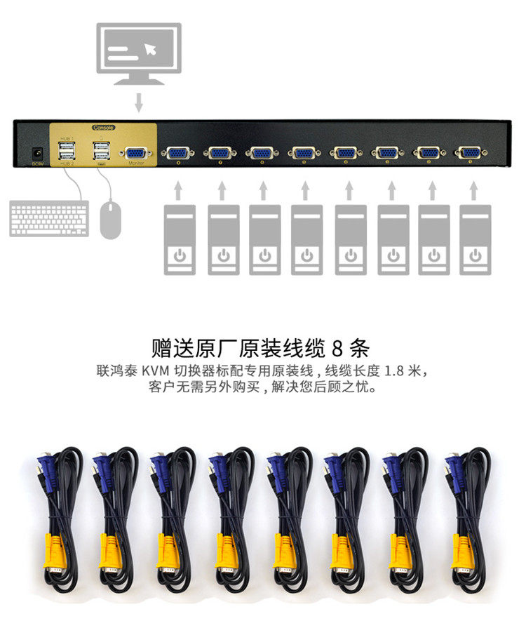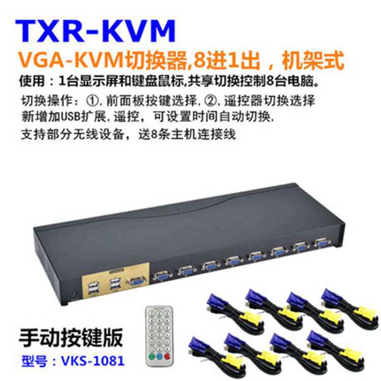 8 computer hosts share a set of mouse keyboard One display Eight into a VGA KVM switcher