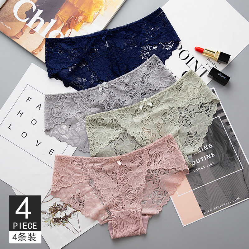 4-pack sexy incognito panties Female lace girl low waist ultra-thin hot hollow cotton crotch briefs head