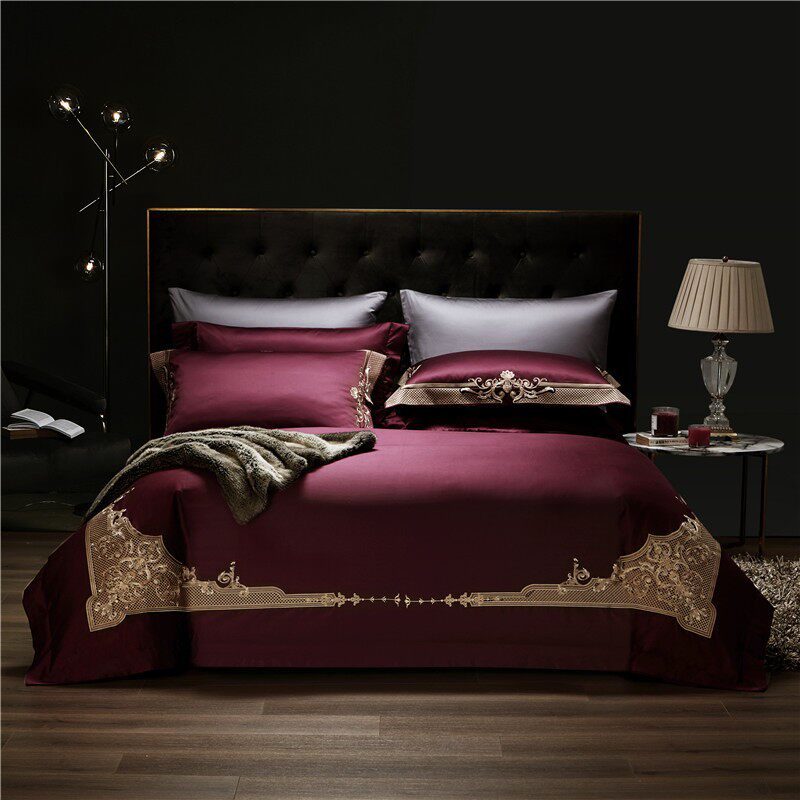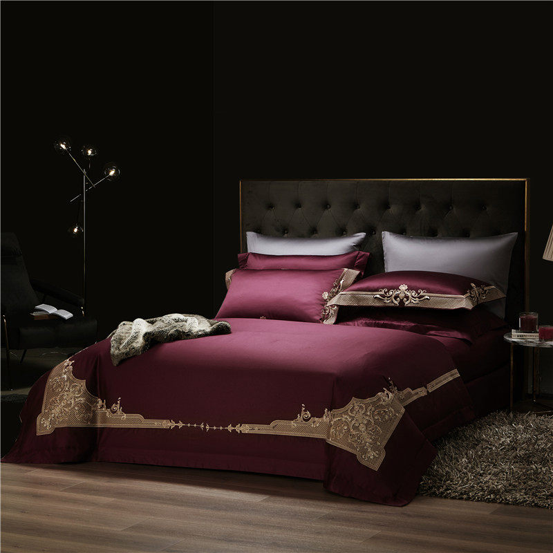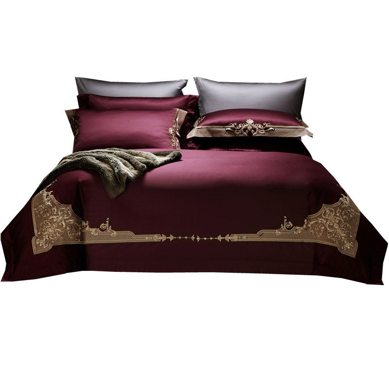 Italian luxury 140-count pure cotton embroidery four-piece wine red high-end quilt cover satin long-staple cotton bedding