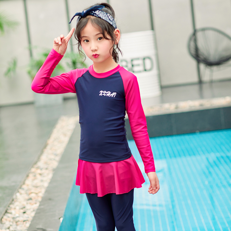 Children's long-sleeved swimsuit girls swimsuit split skirt trousers girls summer sunscreen small middle and big children junior high school students