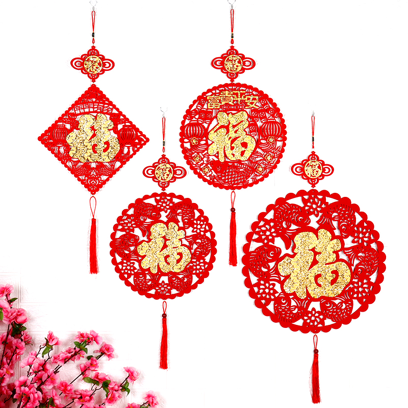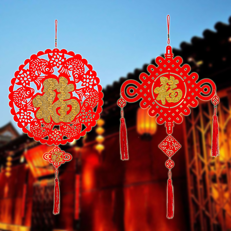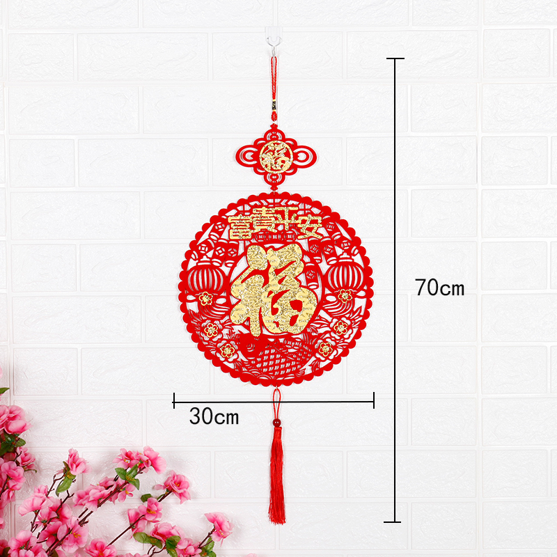 Flocking Chinese knot Fu word lantern stickers Gold year more than glass stickers New Year window grille stickers Spring Festival decoration hanging ornaments
