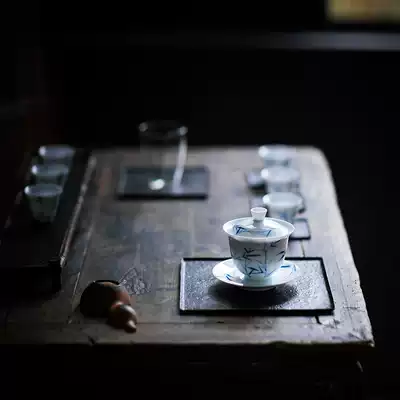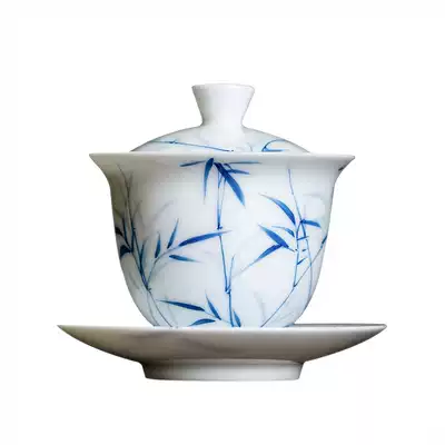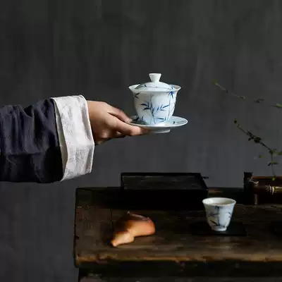 White porcelain hand-painted underglaze blue and white bamboo shadow cover Bowl set three Cai bowl tea cup ceramic Japanese kung fu tea set Tea