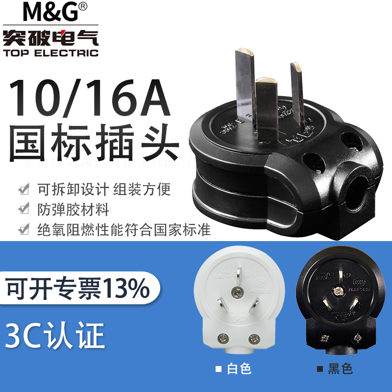 Breakthrough TOP plug pdu self-wiring disassembly plug electrician DIY national standard three-pin plug 10A16A white black