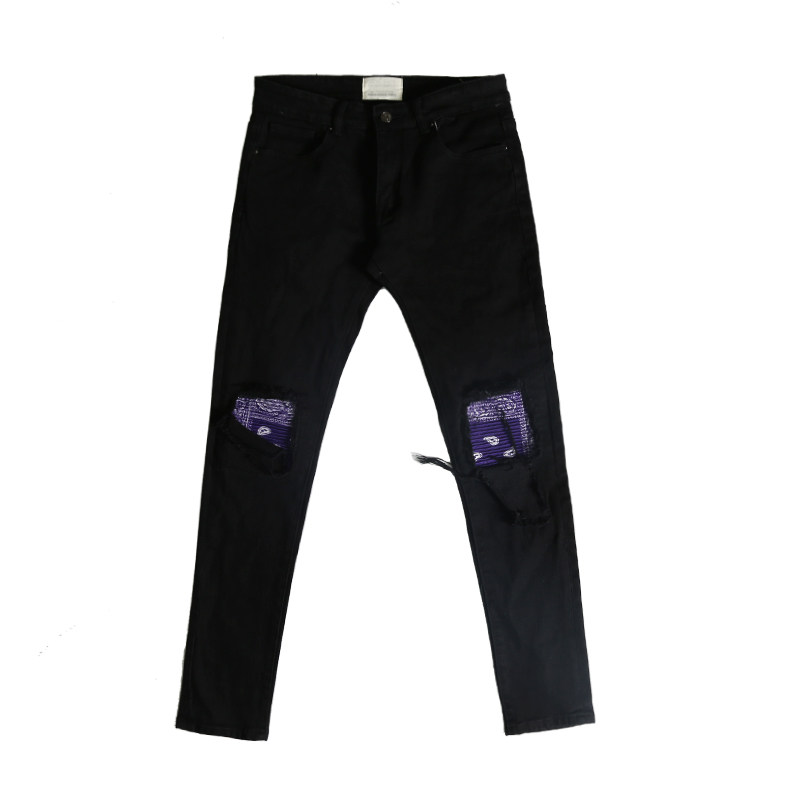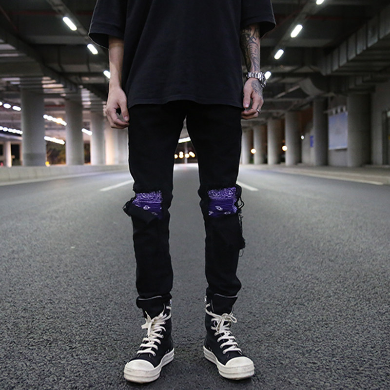 European and American High Street Wind West Coast Cashew Flowers Splicing Patches of Hip Hop Male Hip Hop elastic body black Cowboy smoke pipe pants