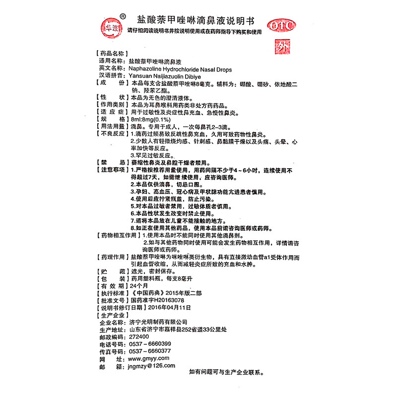 Huabo Naphazoline Hydrochloride Nasal Drops 8ml*1 bottle box Allergic rhinitis Chronic rhinitis