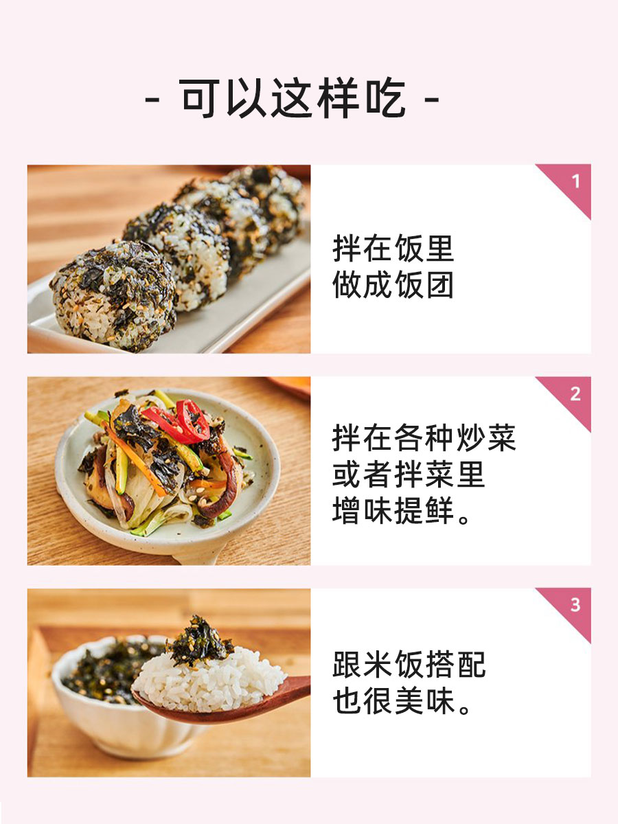 Dried seaweed, white sesame, vegetable oil, sesame oil, edible glucose powder, white sugar, edible salt