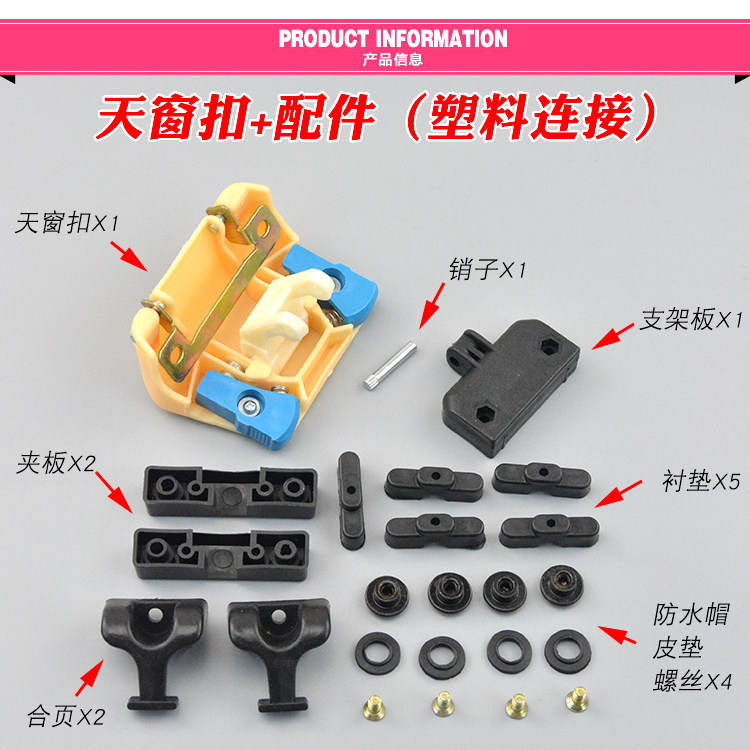 1 plastic connection sunroof buckle 1 iron connection sunroof buckle 1 plastic connection sunroof buckle 1 accessories iron connection sunroof buckle 1 accessories sunroof hinge 2 plywood 2 sunroof screws 4 sets of sunroof hinges