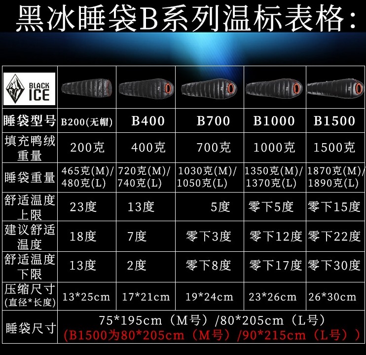 Black ice sleeping bag B400 B700 B1000 B1500 Light duck down down sleeping bag outdoor camping equipment