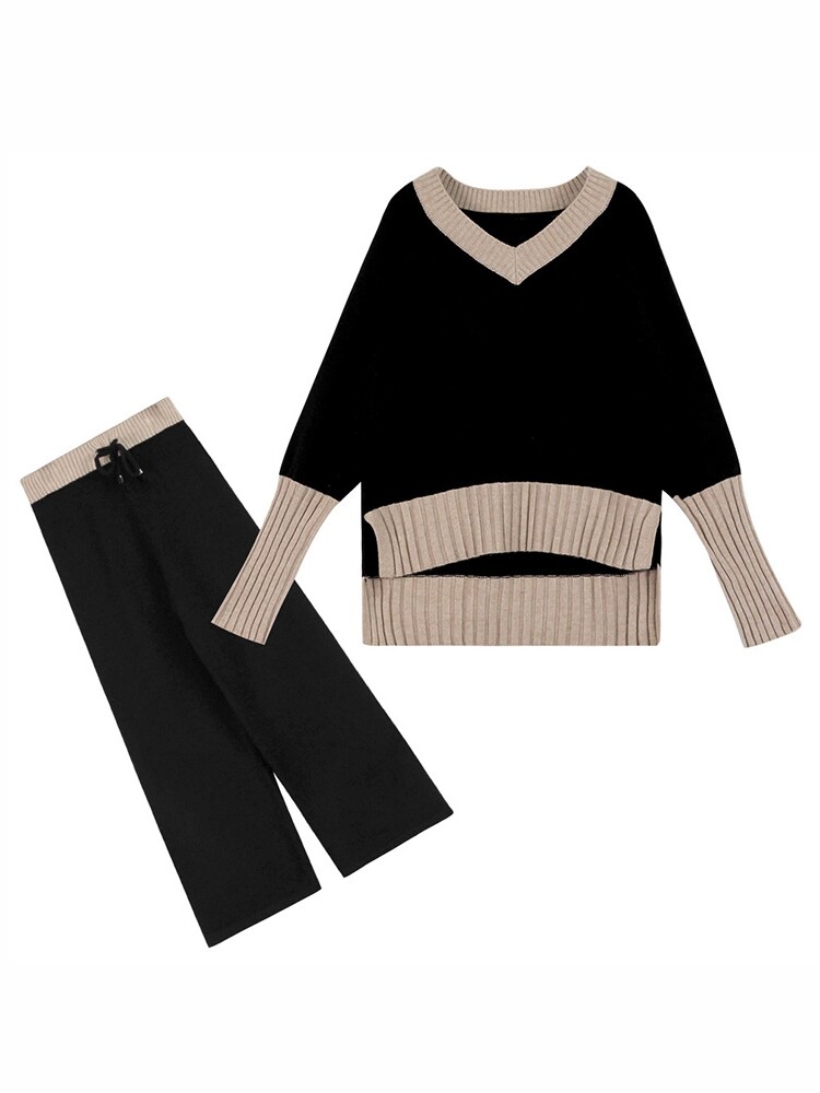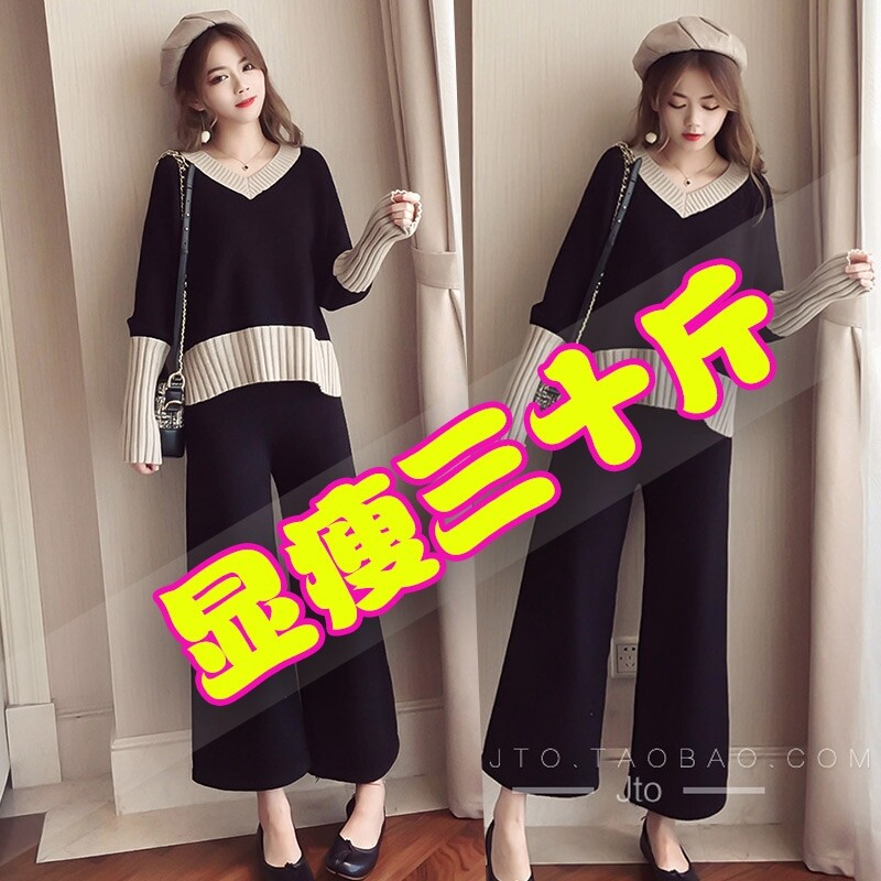 Large size women's clothing fat mm new autumn and winter Western style slimming and age-reducing knitted sweater two-piece suit pants fat sister