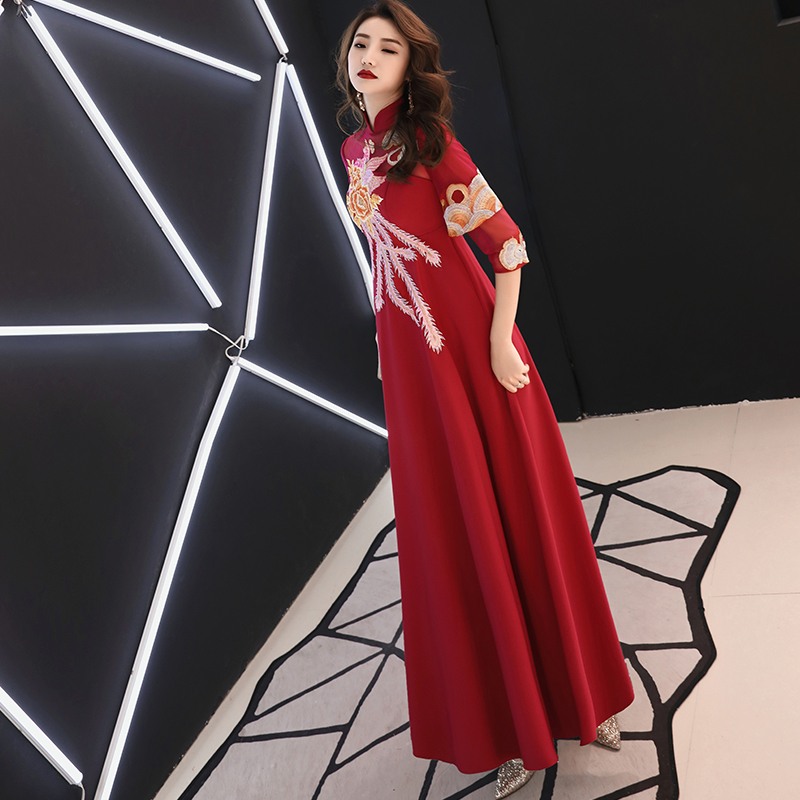 Pregnant woman toast brides with high waisted wine red long sleeves Chinese show and suit big size back door to women fat mm evening gown
