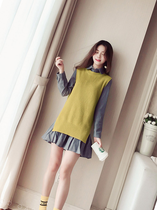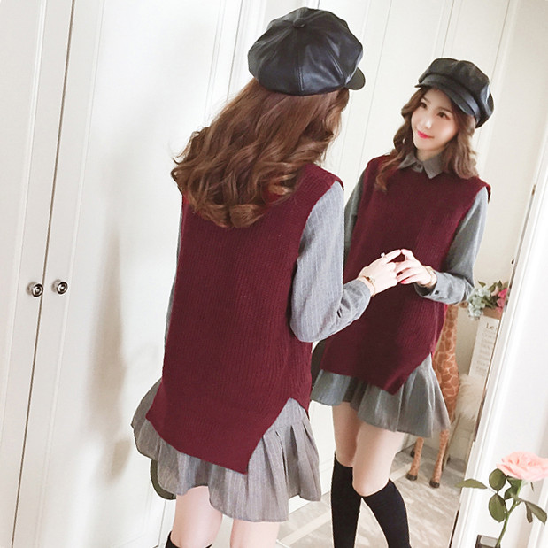 Sweater suit skirt women's two-piece autumn and winter college wind striped shirt mid-length dress knitted vest vest