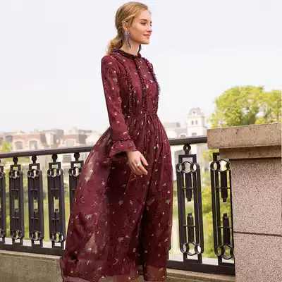 Mulanqiu pleated lace stitching printed long-sleeved dress female stand-up collar midi skirt