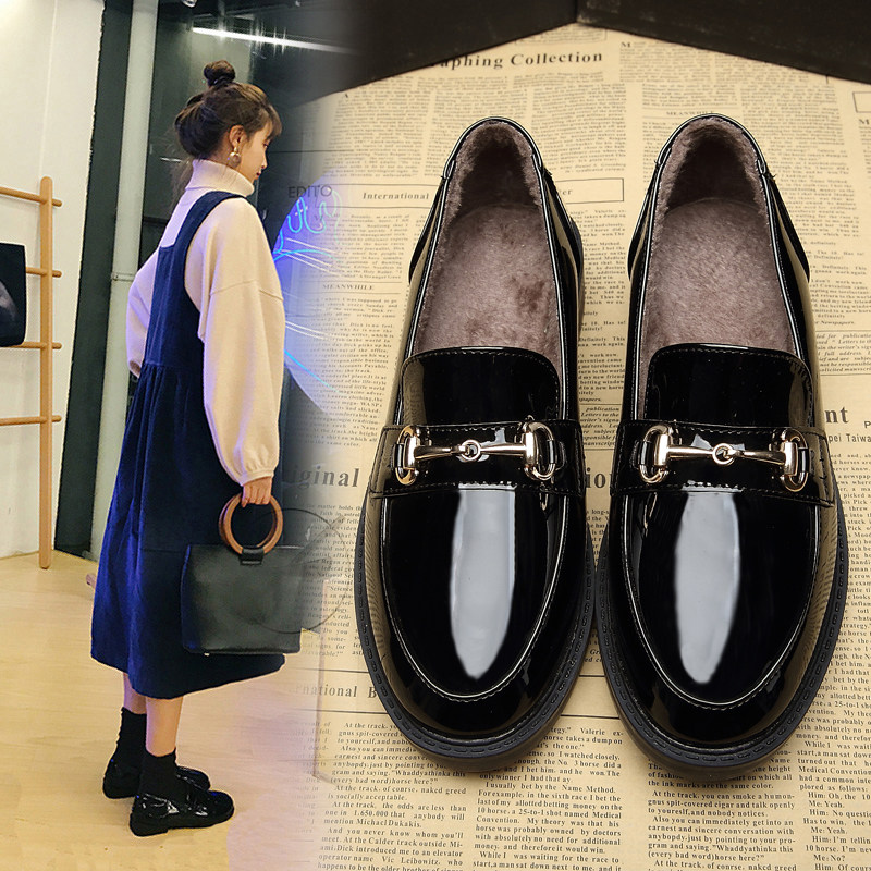 Small leather shoes women's British style women's shoes 2021 new work all-match black slip-on loafer winter fleece