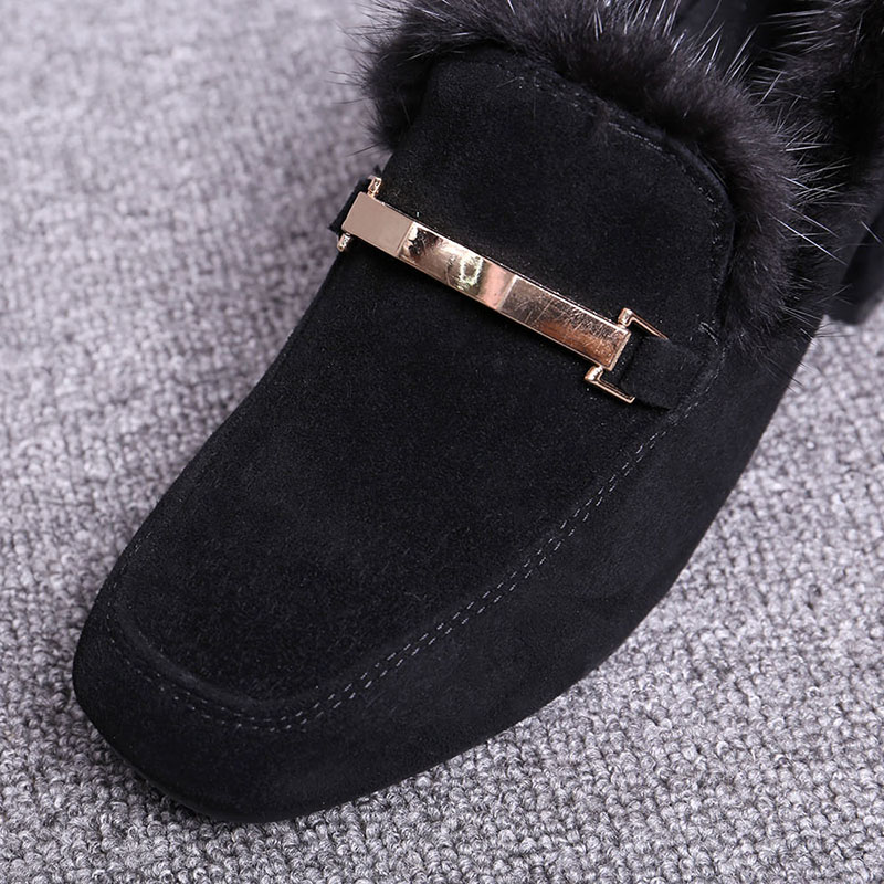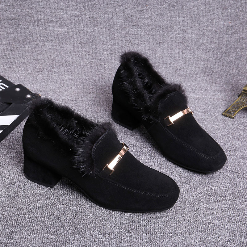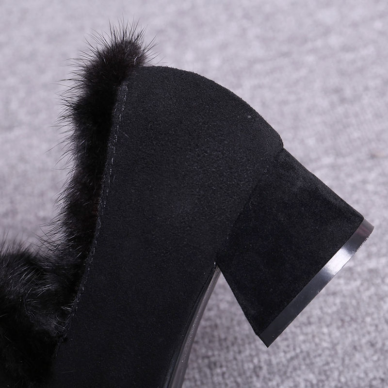 European Station 2023 Winter New Mink Wool Cotton Scoop Shoes Women's Leather Thick Heel Wool Shoes Casual Middle Heel Plus Velvet Shoes