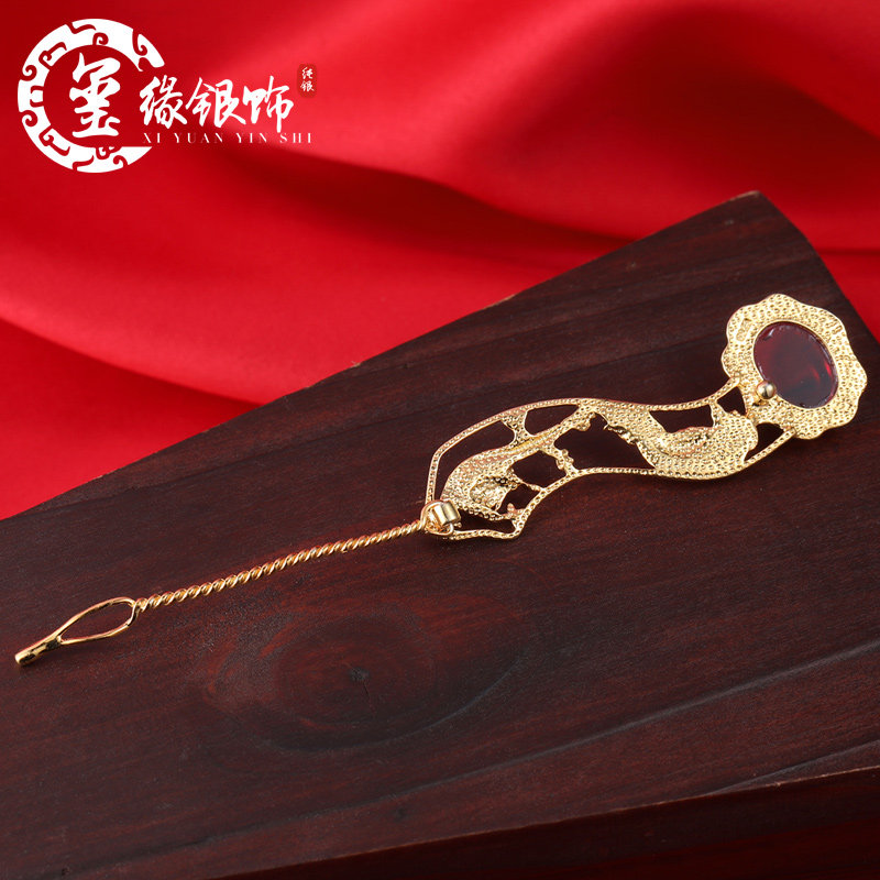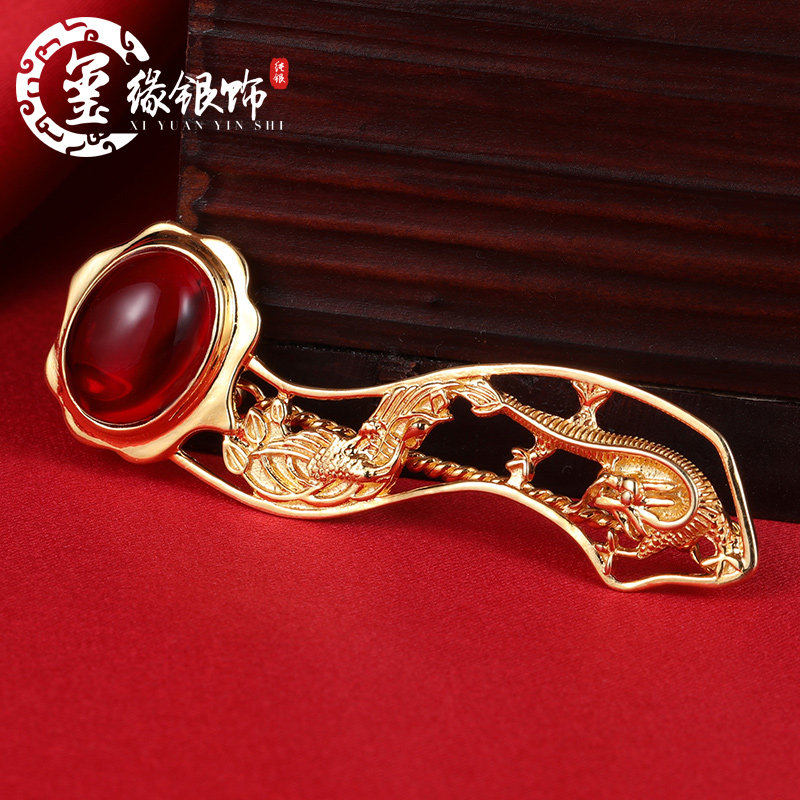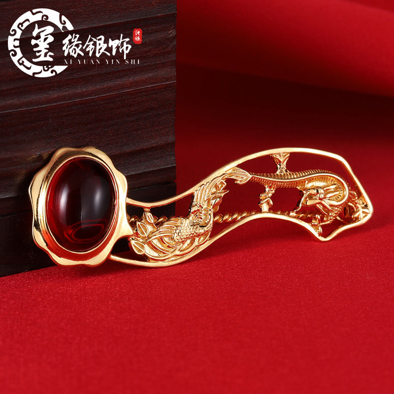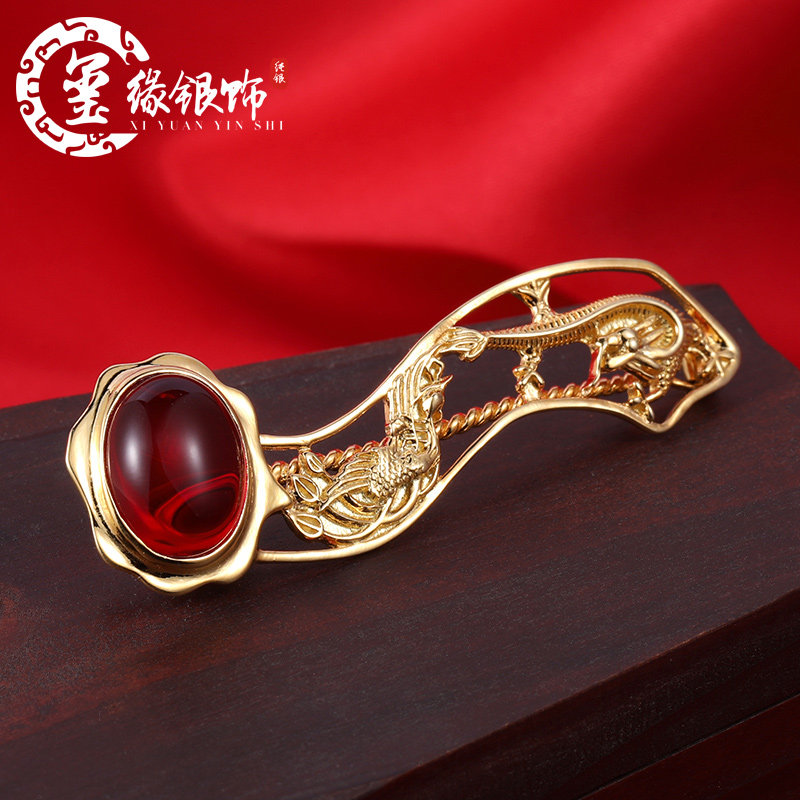 S925 Silver Hairpin Wedding Wishful Hairpin Silver Plated Gold Wedding Silver Jewelry Dragon Phoenix Chengxiang Red Corundum Handmade