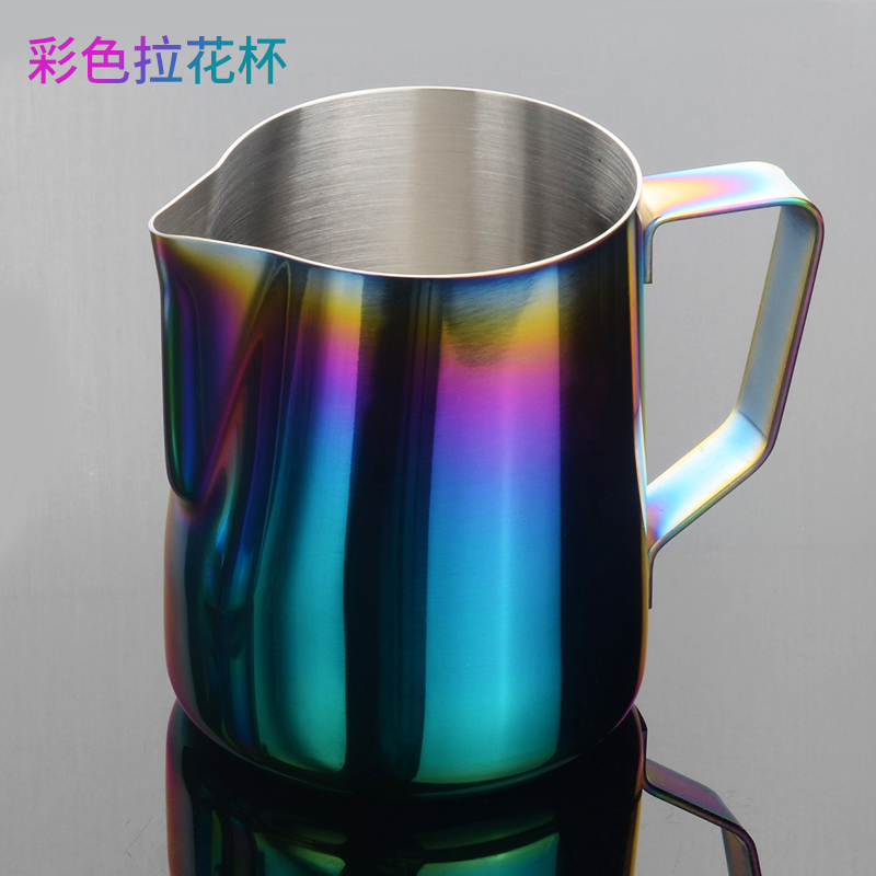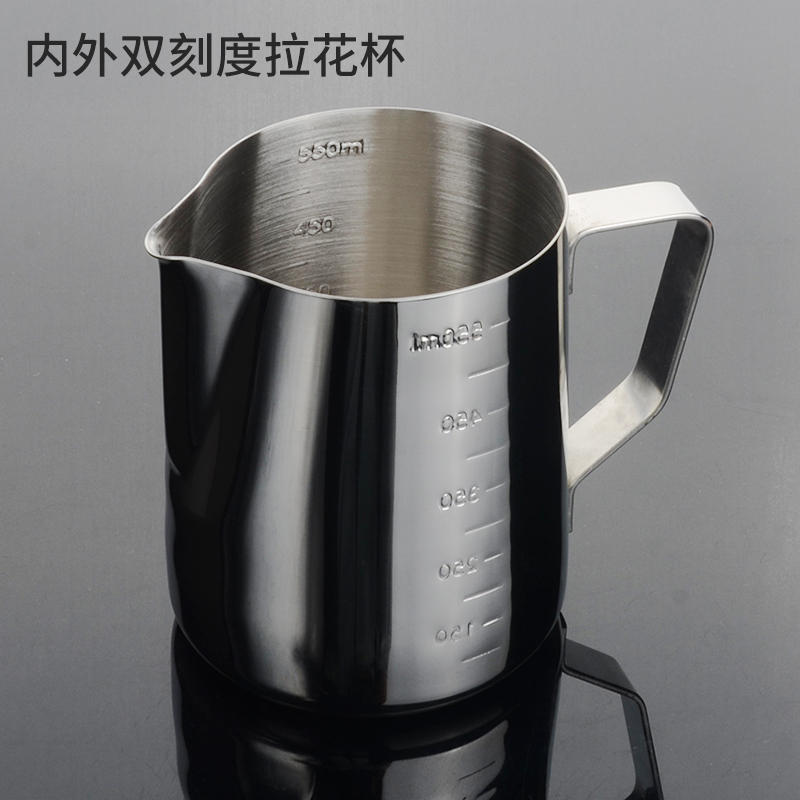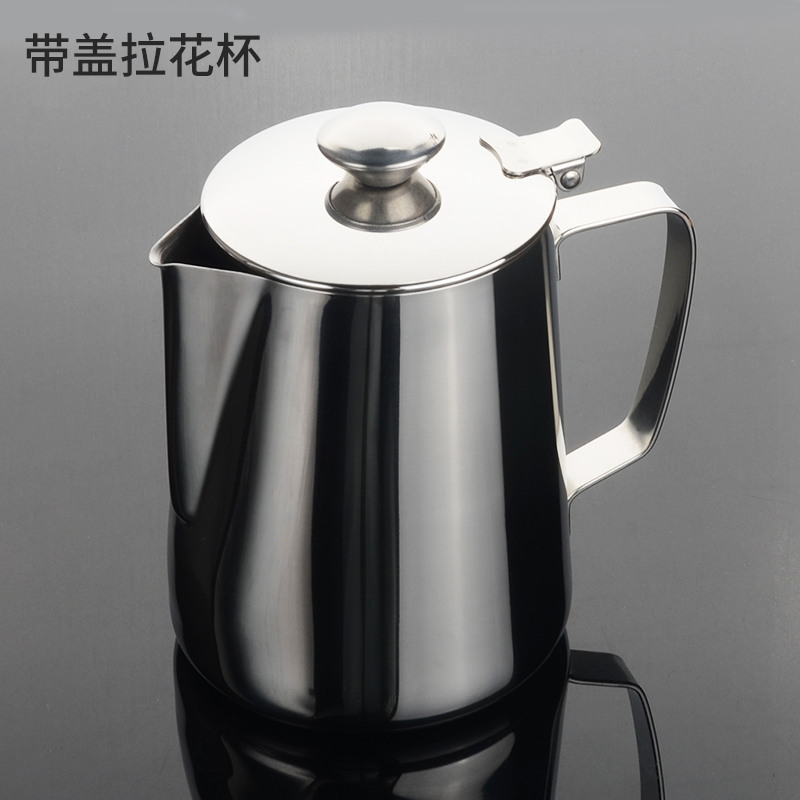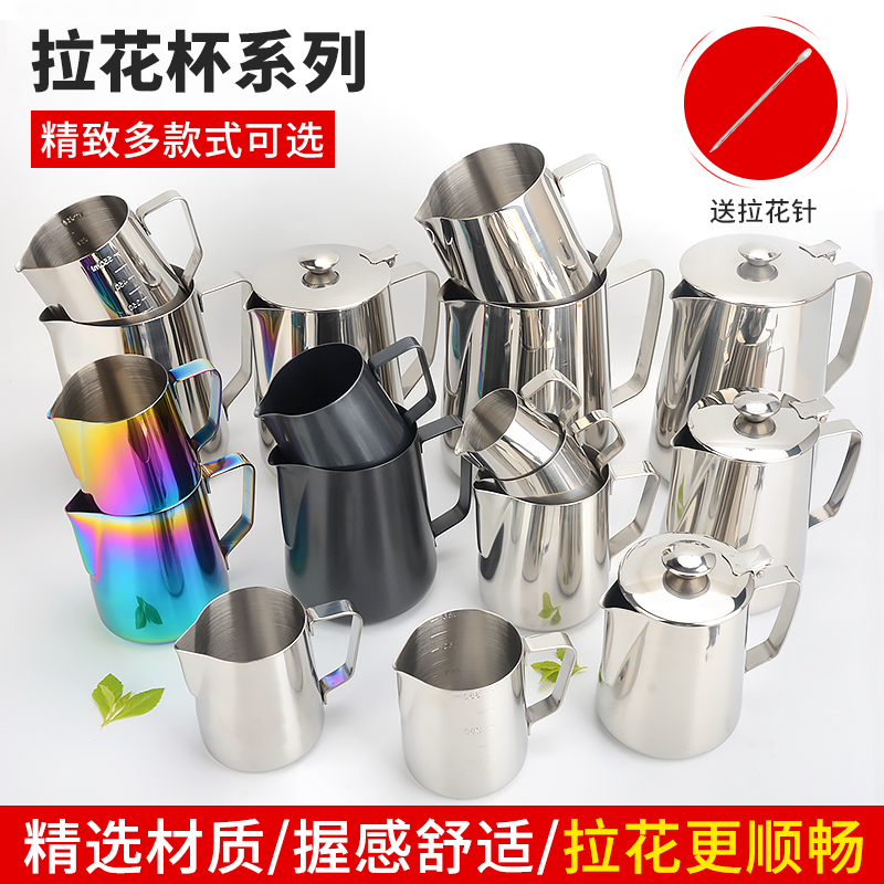 Stainless steel coffee laflower cup with scale pointed mouth with iron pull-in cylinder with lid to make milk bubble cup flower style coffee maker