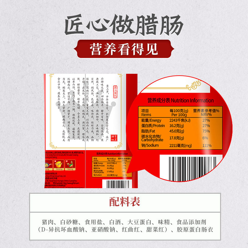 Pork white sugar edible salt white wine soy protein monosodium glutamate food additive (D-sodium iscorbate sodium nitrite red yeast red beet red) collagen casing