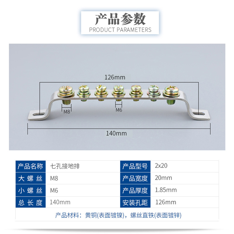 Manufacturer direct sales 7 holes 2 * 20 zero land row grounding line terminals distribution cabinet case ground copper bar brass ground row