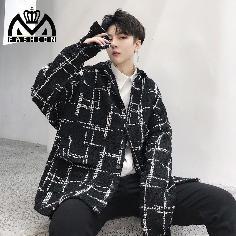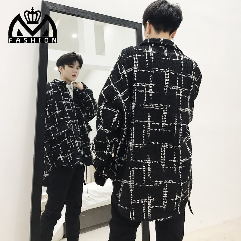Fashion literature loose bat shirt Japanese and Korean tide men's hair coat personality Elegant dark black grid men's shirt winter
