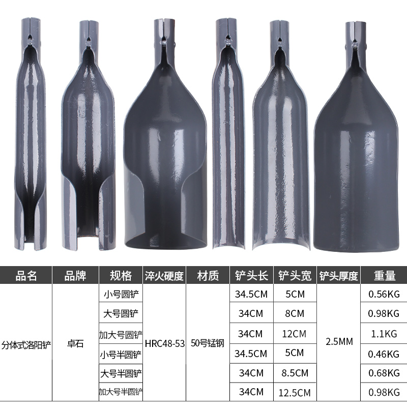 Small semi-circular shovel head Small round shovel head Large semi-circular shovel head Large round shovel head 1 m handle 0.5 m handle T-shaped handle Large semi-circular shovel head Large round shovel head Luoyang shovel carry bag