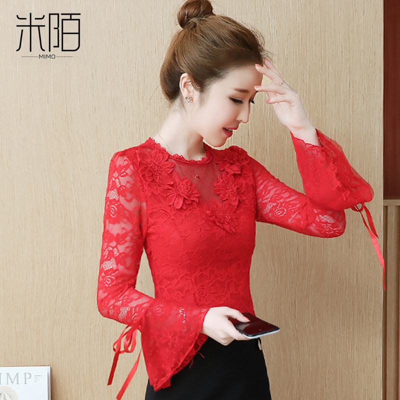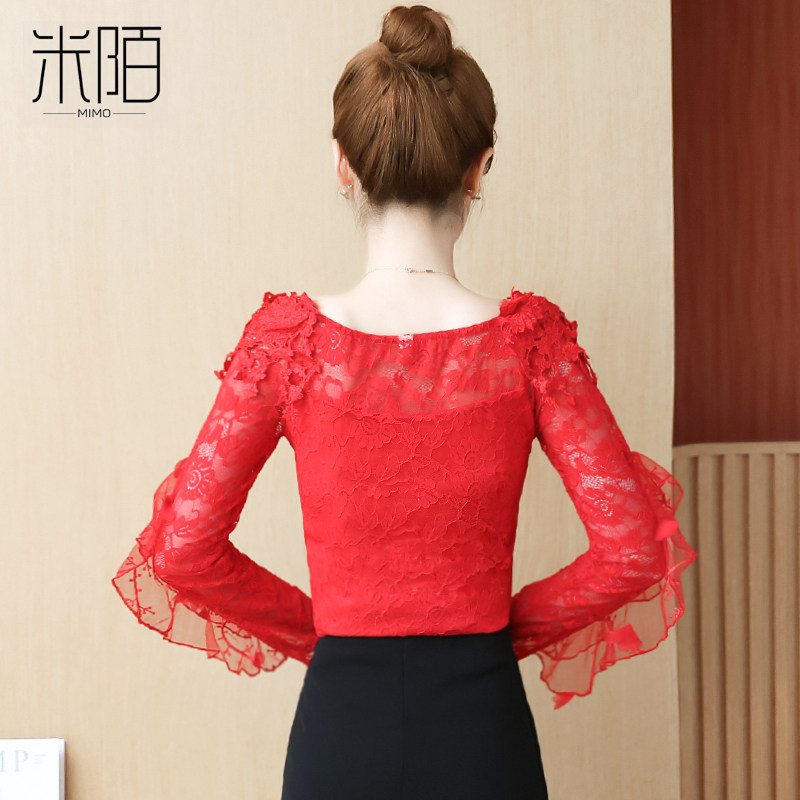 Early spring red long-sleeved T-shirt women's spring 2021 new inner lace top wild Western school base shirt