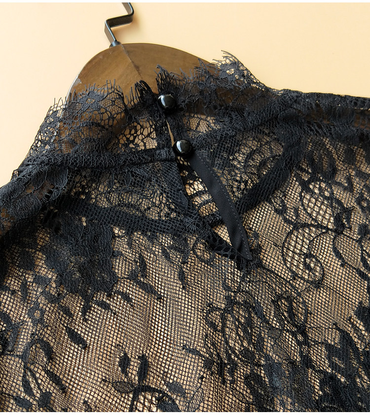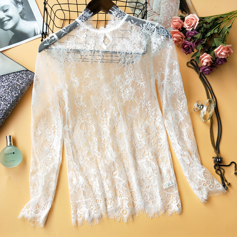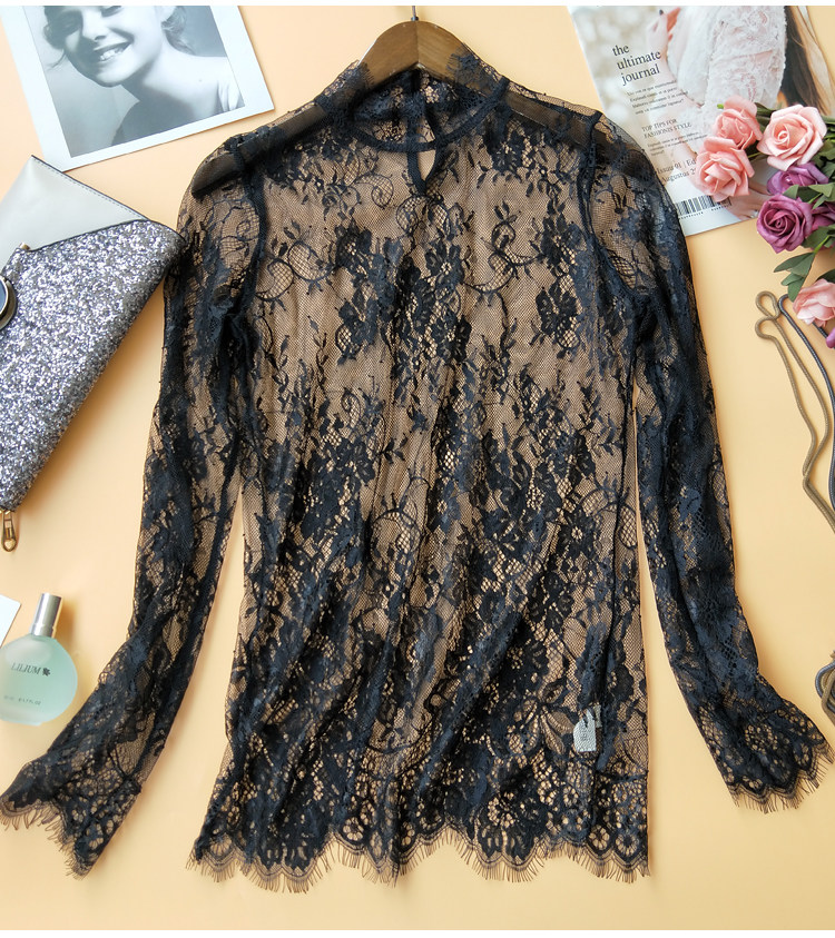 High-end custom spring new Korean stand collar high collar see-through eyelashes lace long-sleeved bottoming shirt for women