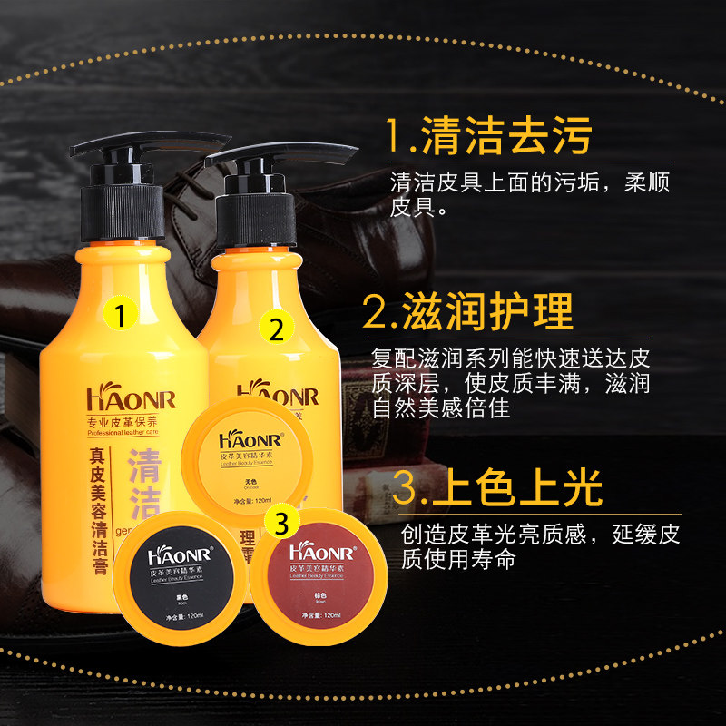 Colorless essence Huin 1 box delivered polished brown essence 1 box send polished black finishin 1 box send polished clean cream 1 bottle send cleaning towel care cream 1 bottle send clean towel clean