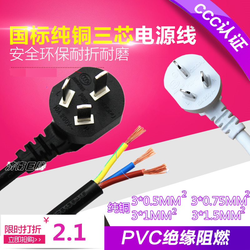 Pure copper national standard three core power core with plug 3 core 0 75 1 5 square 10A plug line three - hole high power