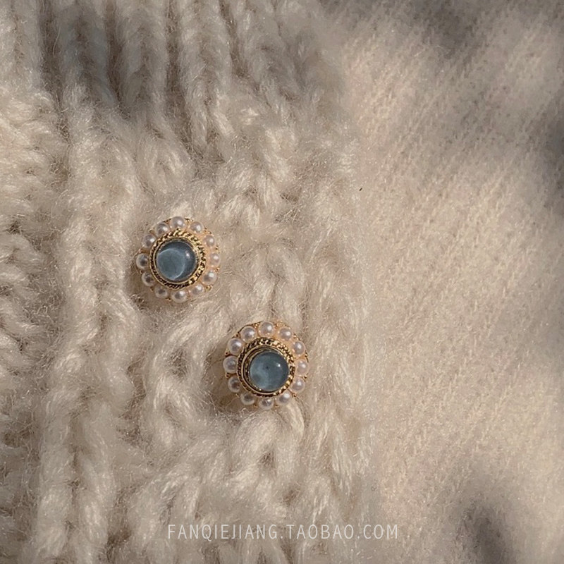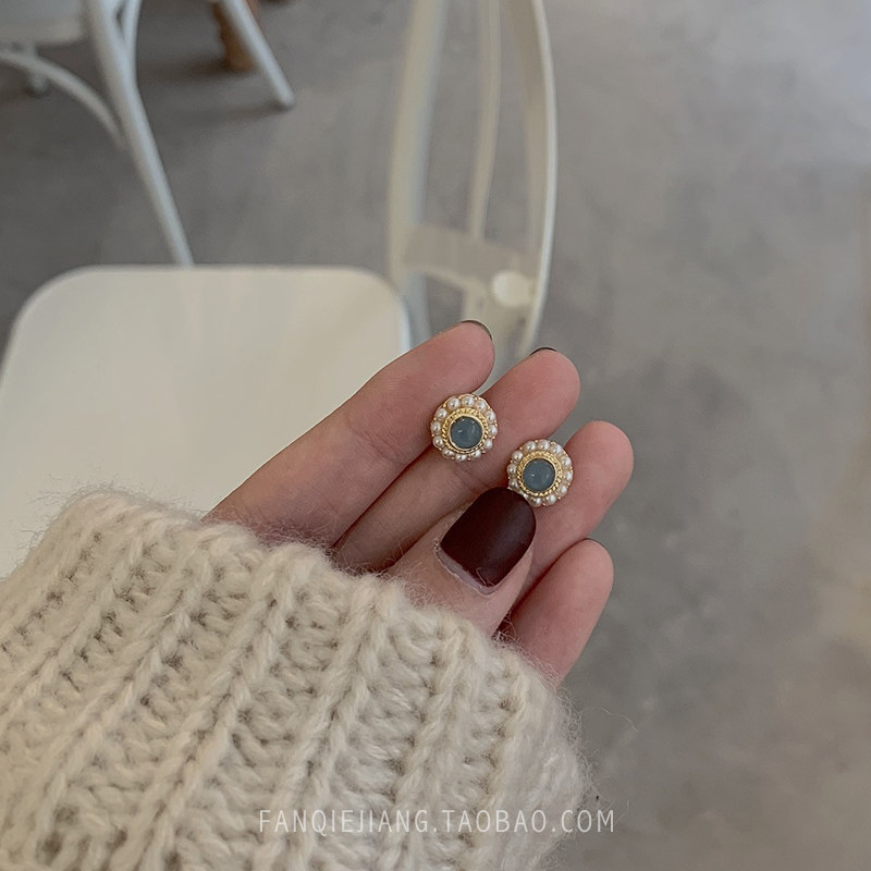 Sleeping without picking smog blue French pearl earrings female sterling silver temperament Korean personality simple retro earrings