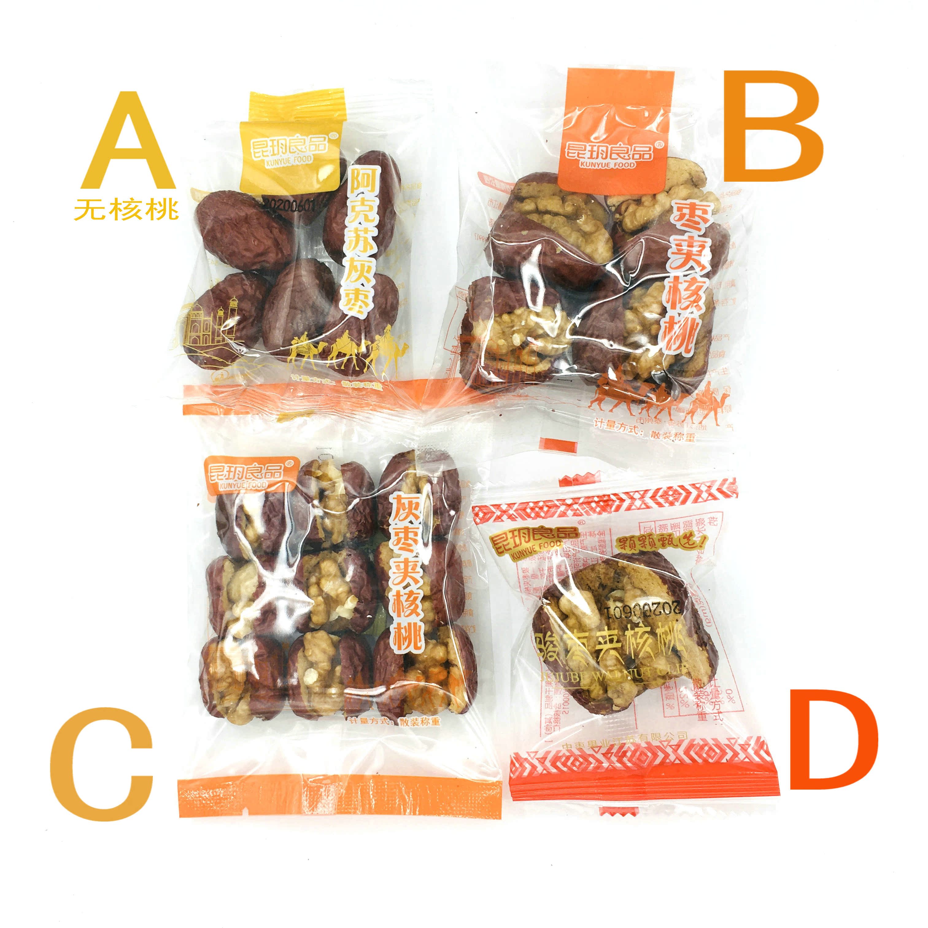 A gray jujube clutch bag (3A) A piece of 6 kg B four junjube clip walnuts A piece of 6 kg C first-class gray jujube clip walnuts(9 pieces)A piece of 6 kg D junjube clip walnuts (single piece) A piece of 6 kg