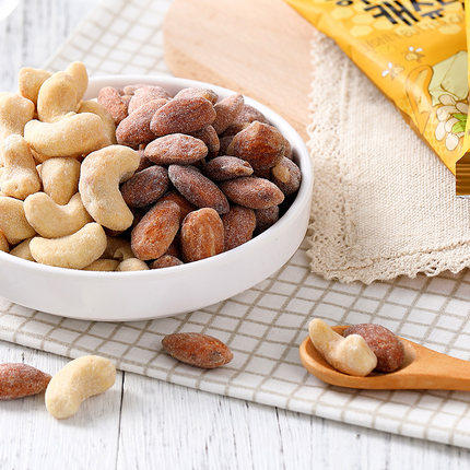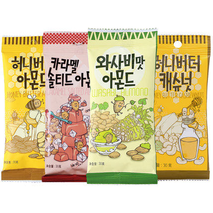 Turkey flavor (almonds) Caramel salt baked (almonds) Honey butter (almonds) Yogurt flavor (almonds) Mustard flavor (almonds) Honey butter (cashews) Honey butter (mixed nuts) Strawberry flavor (almonds) Nori flavor (almonds) Seaweed flavor (almonds) Roasted corn flavor (almond) Stir-fried rice cake flavor (almond kernel) Garlic flavor Toasted bread diced flavor (almond kernel) Brown sugar milk tea flavor (almond kernel) Cream cookie flavor (almond kernel) Glutinous rice cake flavor (almond kernel) Jumping star (almond) Toffee latte flavor (almond kernel) Tiramisu flavor (almond kernel) Chocolate flavor crispy ball (almond)