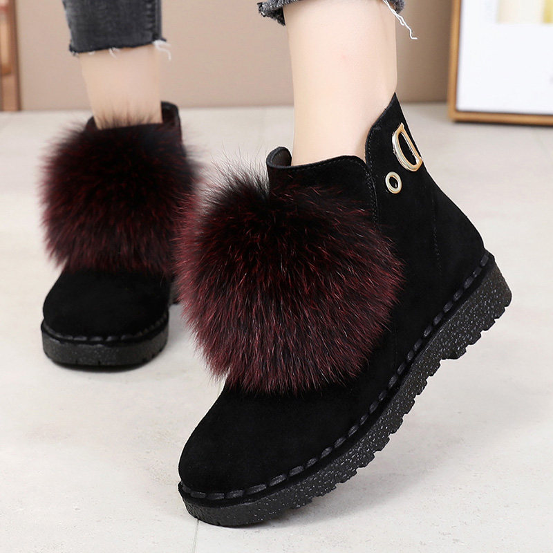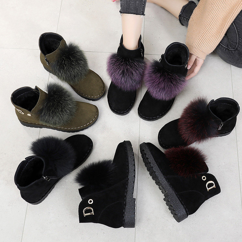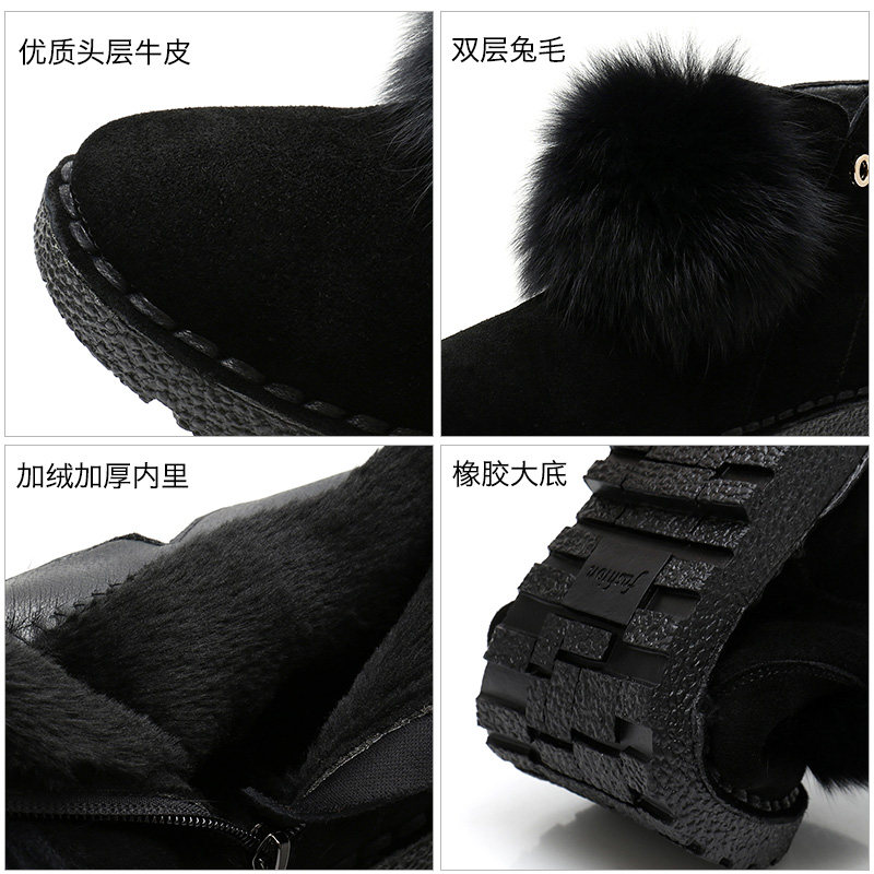 Rabbit Hair Snowshoeing Boots Woman Shoes Leather Face Warm Cotton Shoes Winter Plus Suede Thickened Frosted Genuine Leather Soft Bottom Flat Bottom Short Boots