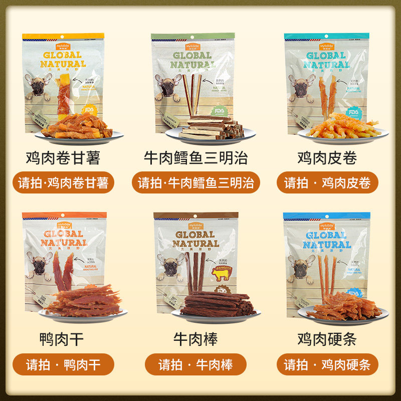 Duck jerky, chicken stick, beef stick, chicken skin roll, beef cod sandwich