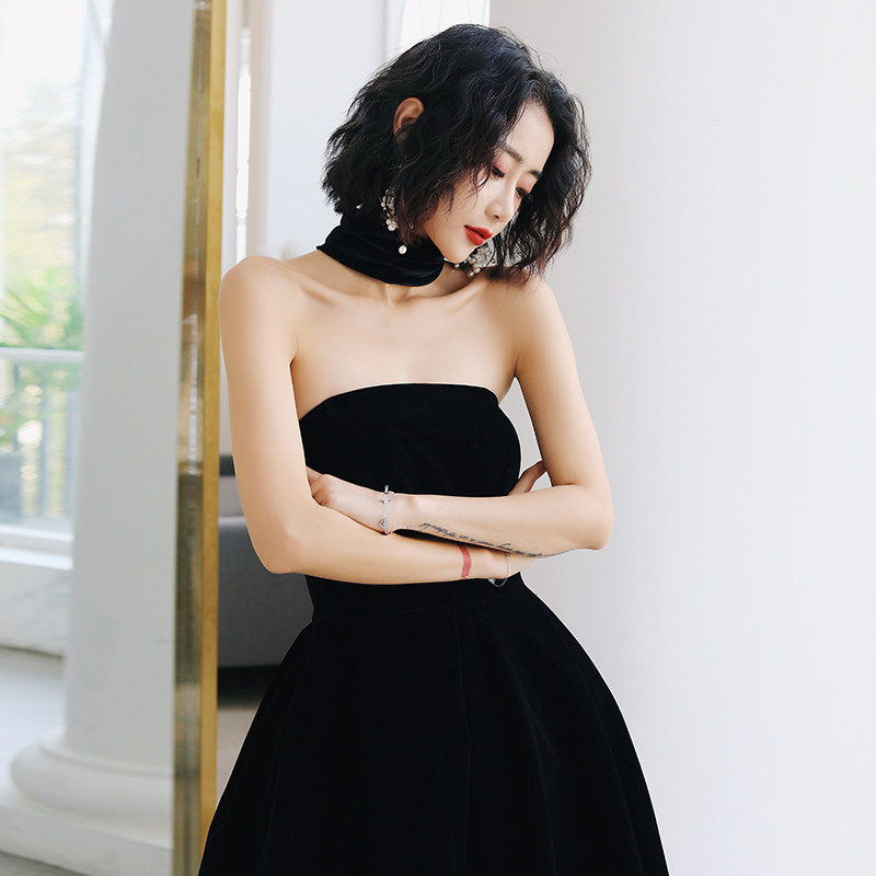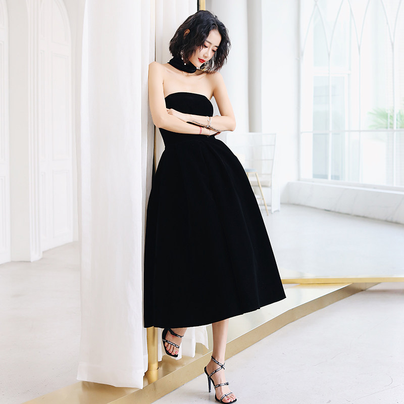 Little man evening dress skirt female banquet socialite temperament Black thin birthday party dress Velvet medium-long version