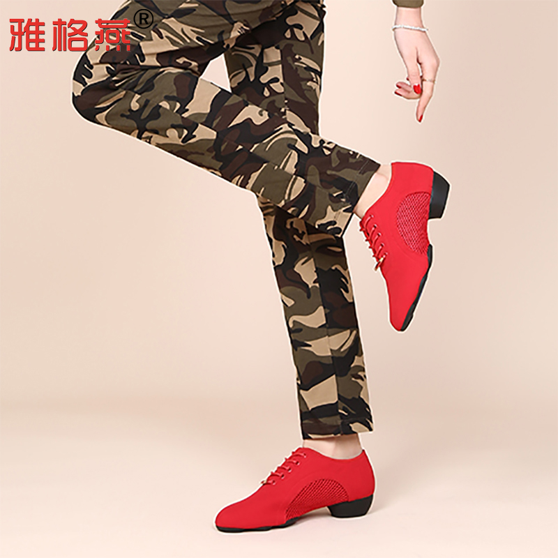 Red Latin dance shoes female style adult with soft bottom teacher shoes net face Oxford cloth dance shoes genuine leather practice shoes