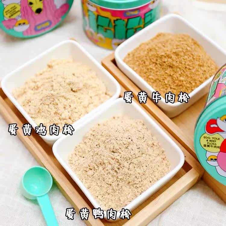 Egg yolk chicken floss-90g egg yolk duck floss-90g egg yolk rabbit floss 90g egg yolk salmon floss 110g roast chicken floss 120g roast duck floss 120g