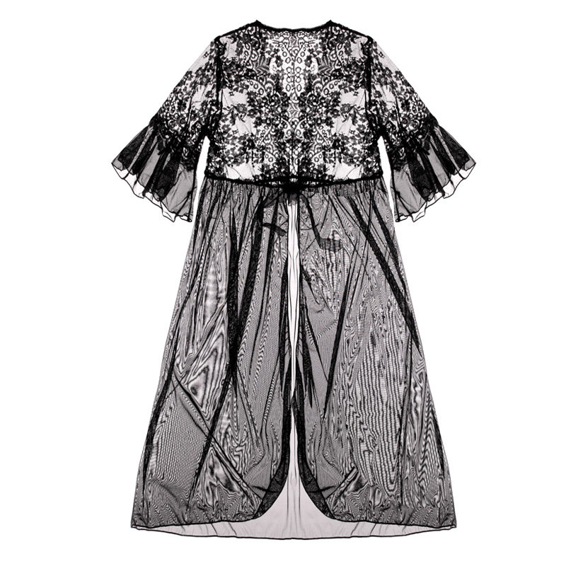 Fan-style ultra-thin sexy cardiovert lace lace long version sleeping robe woman extremely seductive mesh yarn clairvoyt clear pyjamas jacket