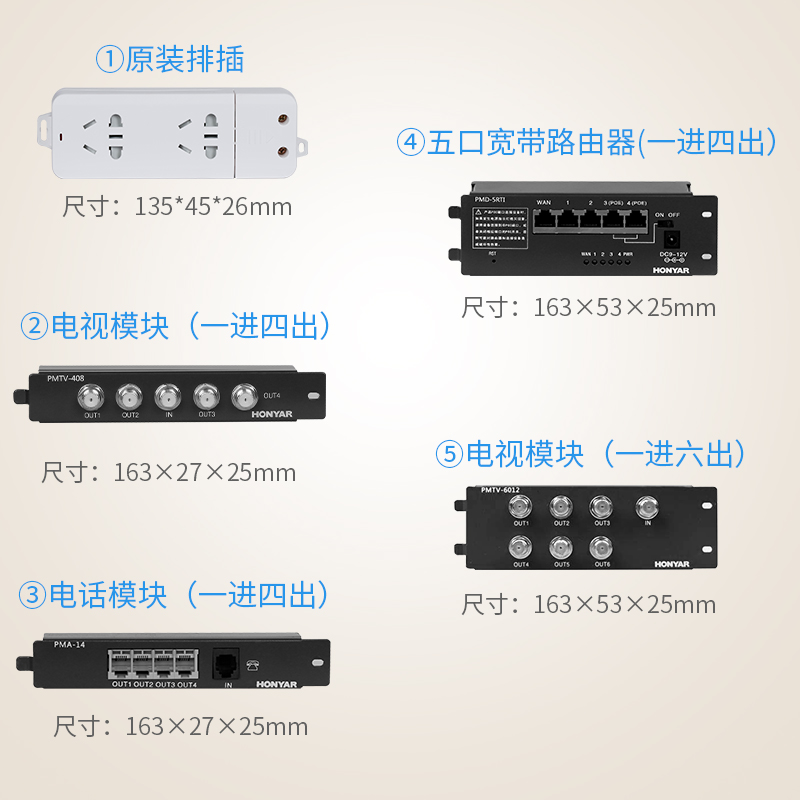 Three-position seven-hole wire socket (dedicated to information box) backpack power TV distributor 1 point 4 module TV distributor 1 point 6 module Phone 1 point 4 module phone 2 in 4 out module
