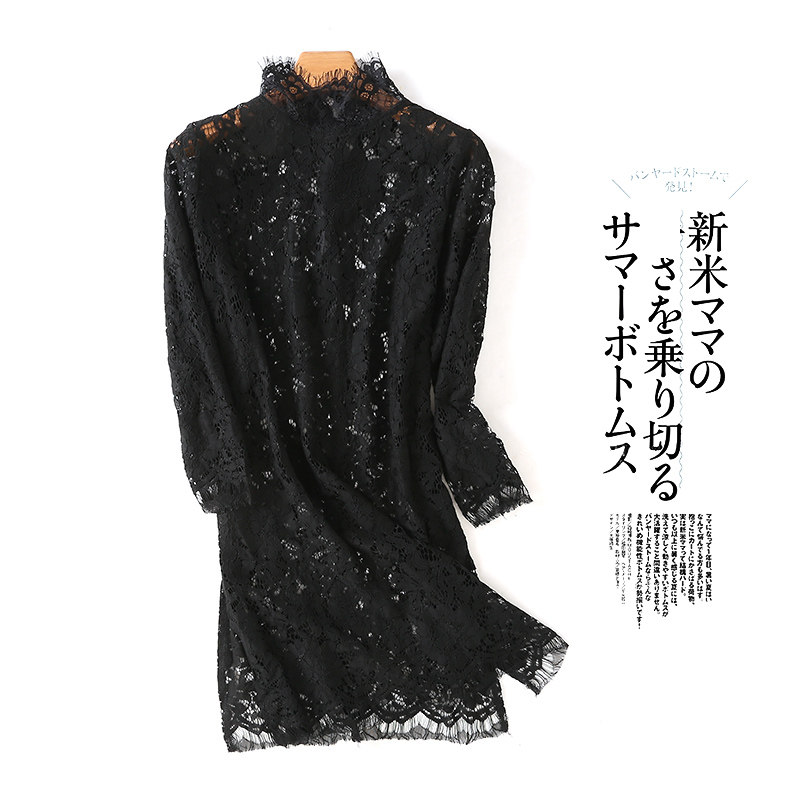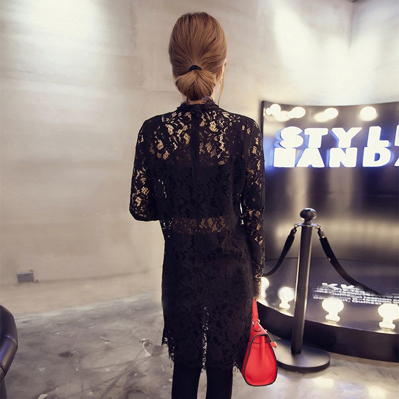 Korean long-sleeved stand-up collar eyelashes lace bottoming shirt hollow perspective inner wear outer wear blouse lace collar sexy skirt