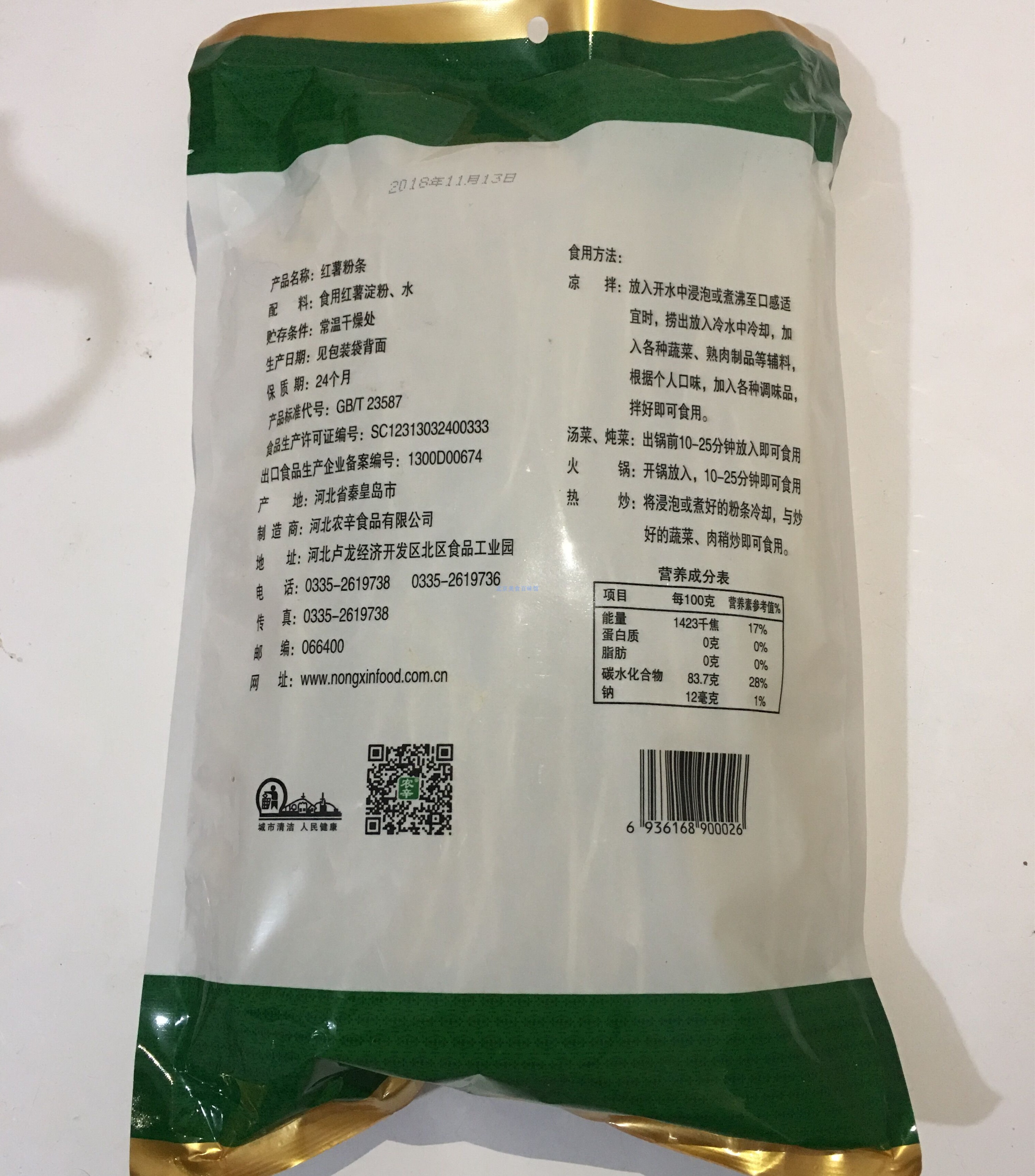 2 bags full of Nongxin pure sweet potato vermicelli straight thin 500g sweet potato vermicelli vermicelli green food