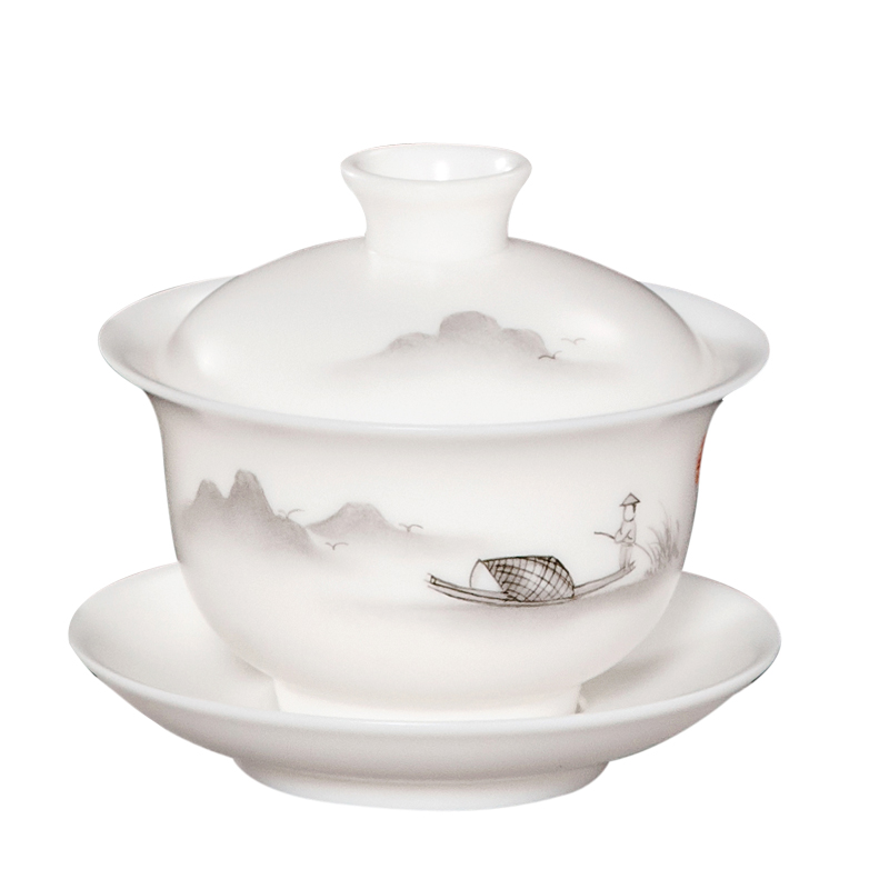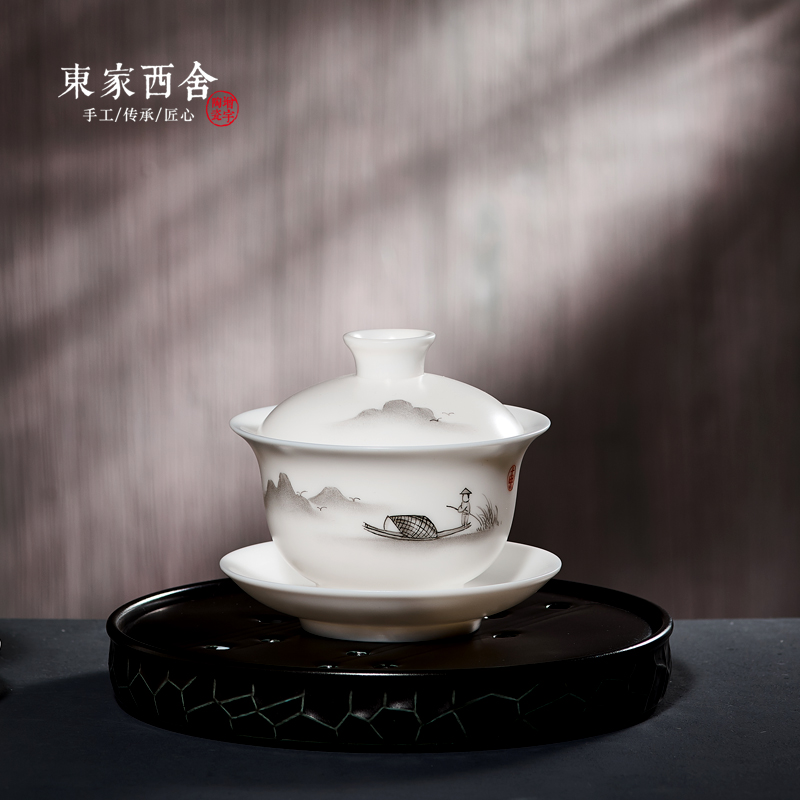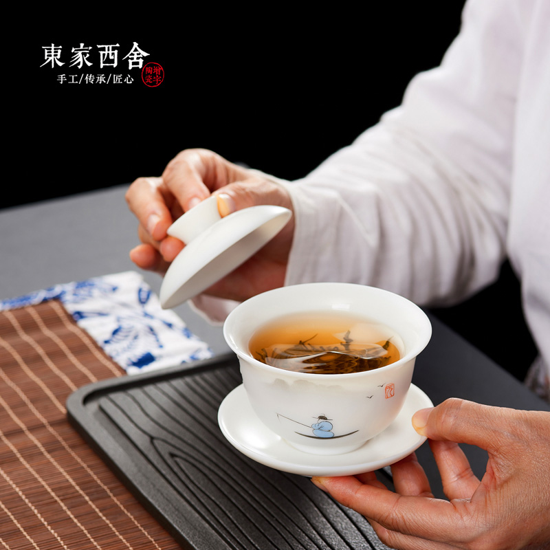 Sancai bowl tea cup high-grade goat jade porcelain bowl tea set Dehui white porcelain pure hand-painted Kung Fu Tea Bowl