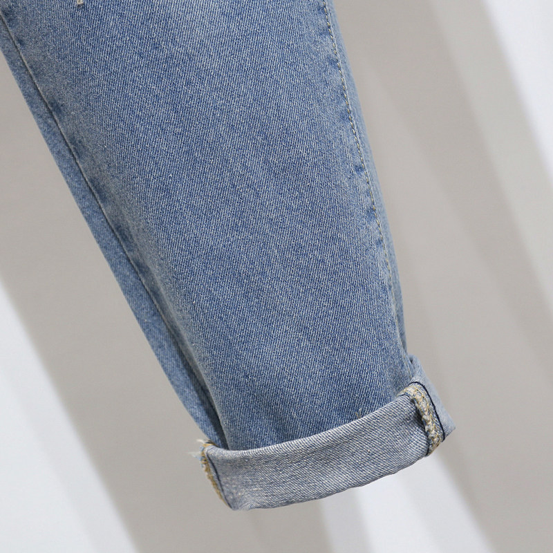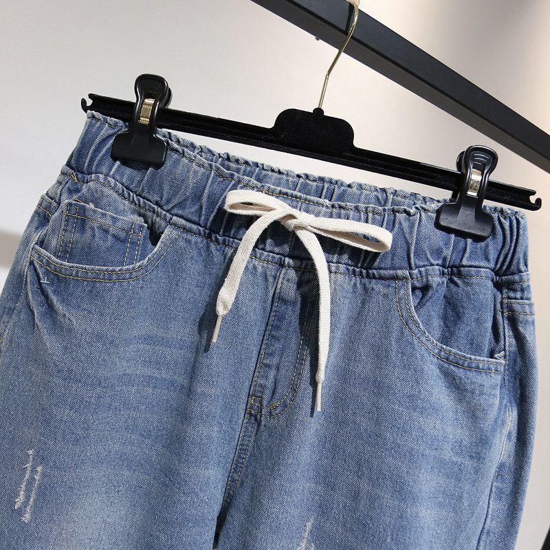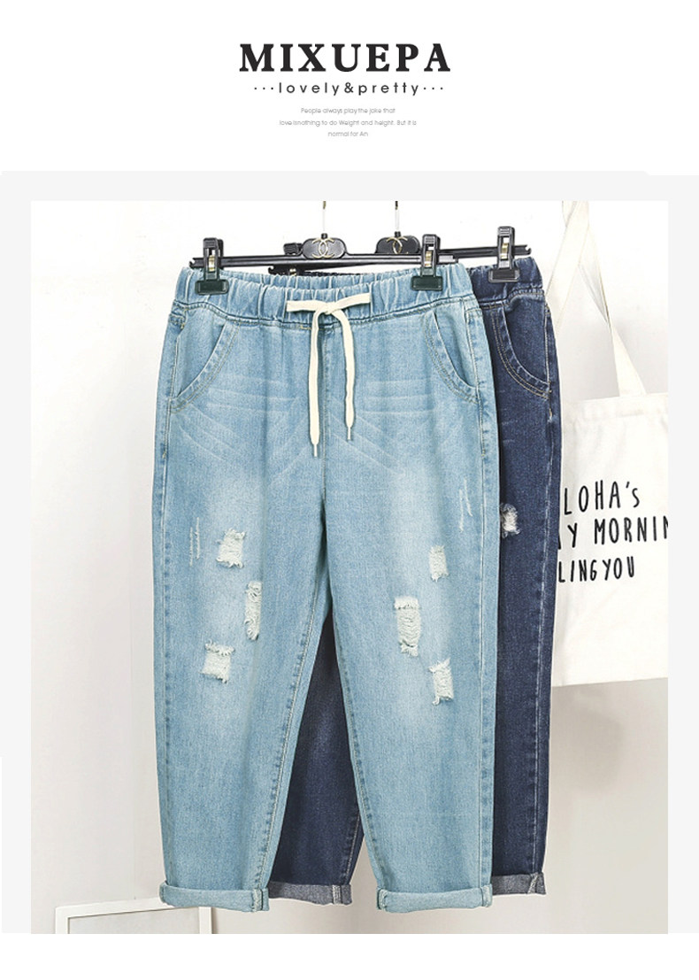 Loose large size jeans female fat MM hole 200 pounds plus fat increase students elastic waist high waist Harem pants tide