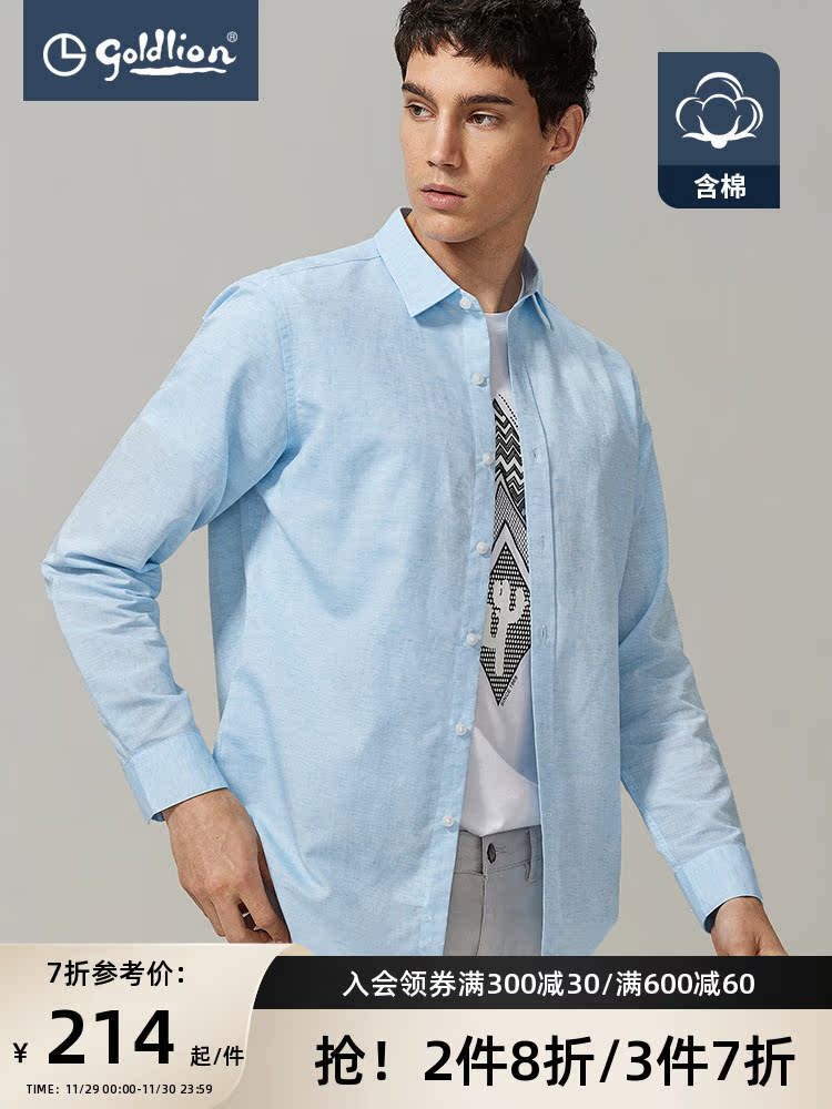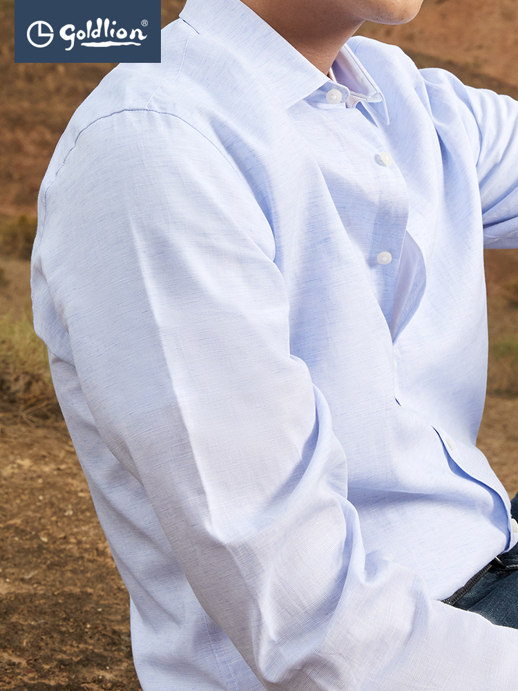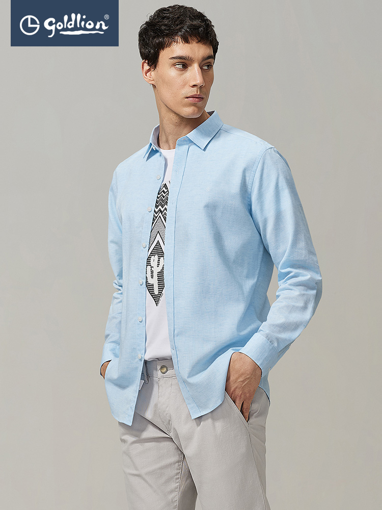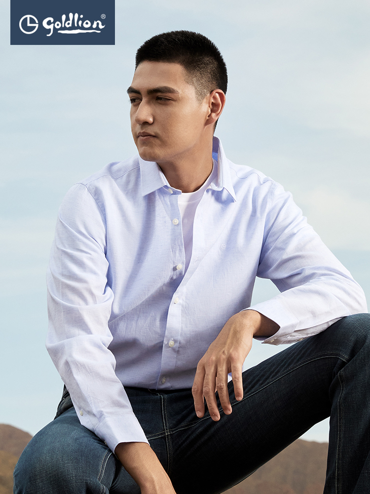 Goldlion men's linen blended Oxford spinning washed white fashion business casual all-match long-sleeved shirt (Hui)