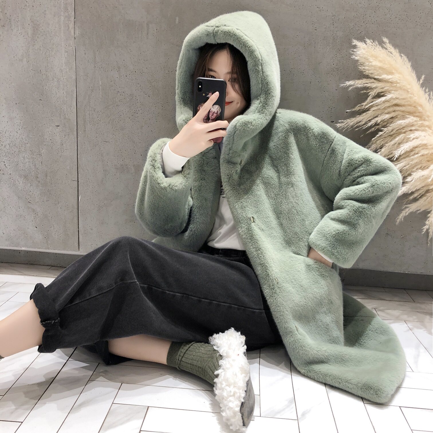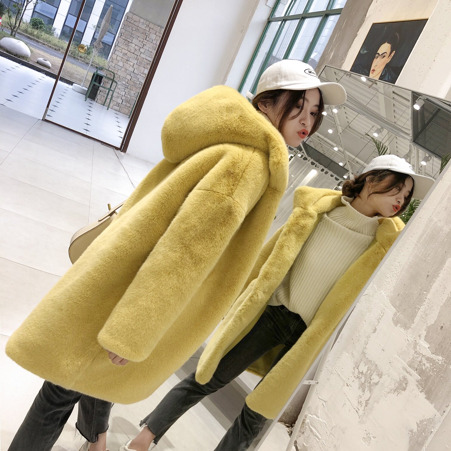 Net red new fur jacket thickened with medium long version loose even cap Buffy mink wool artificial fur coat for women's winter
