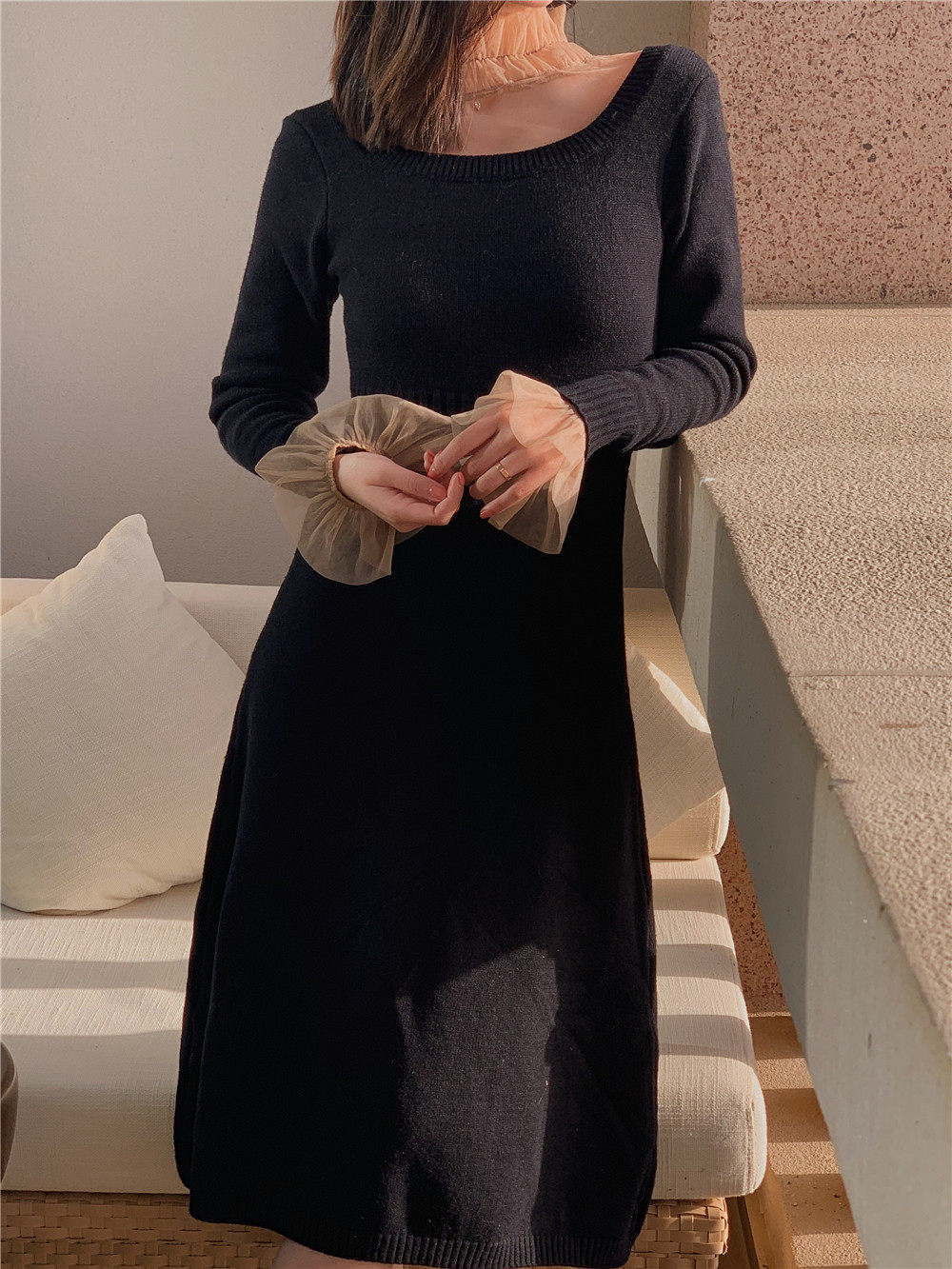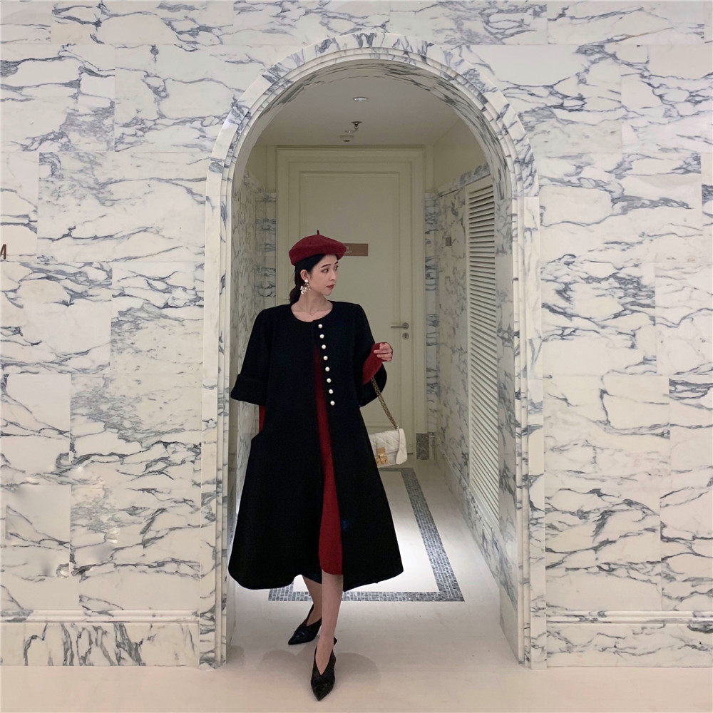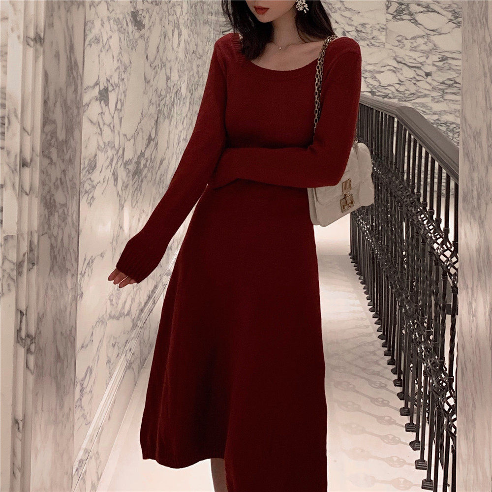 WALKINDARK] 2020 autumn and winter new temperament retro waist square collar thick knitted dress sweater skirt