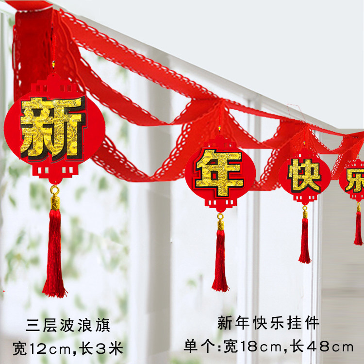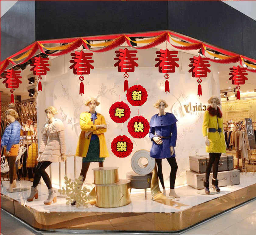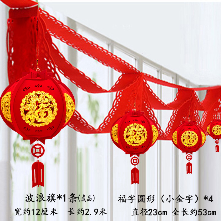New Year's Day wave flags pull flowers to arrange colorful flags to decorate large red lanterns Fueword Spring word jewelry store to hang accessories for festive items