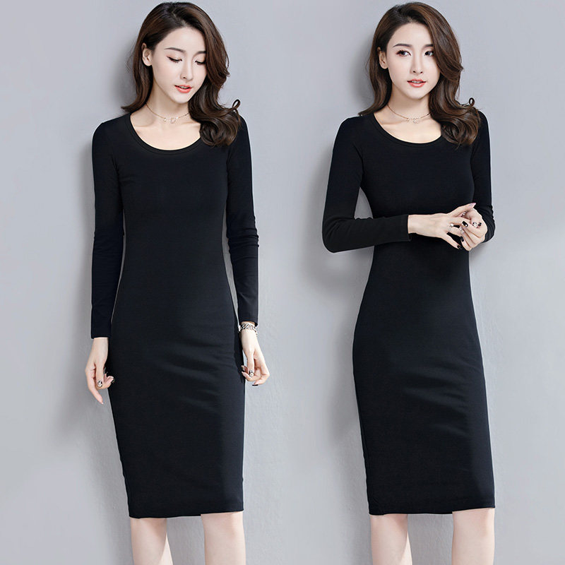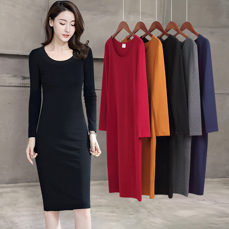 Dress 2021 spring and summer new long-sleeved bottom skirt women's slim round neck knitted versatile medium and long version long skirt
