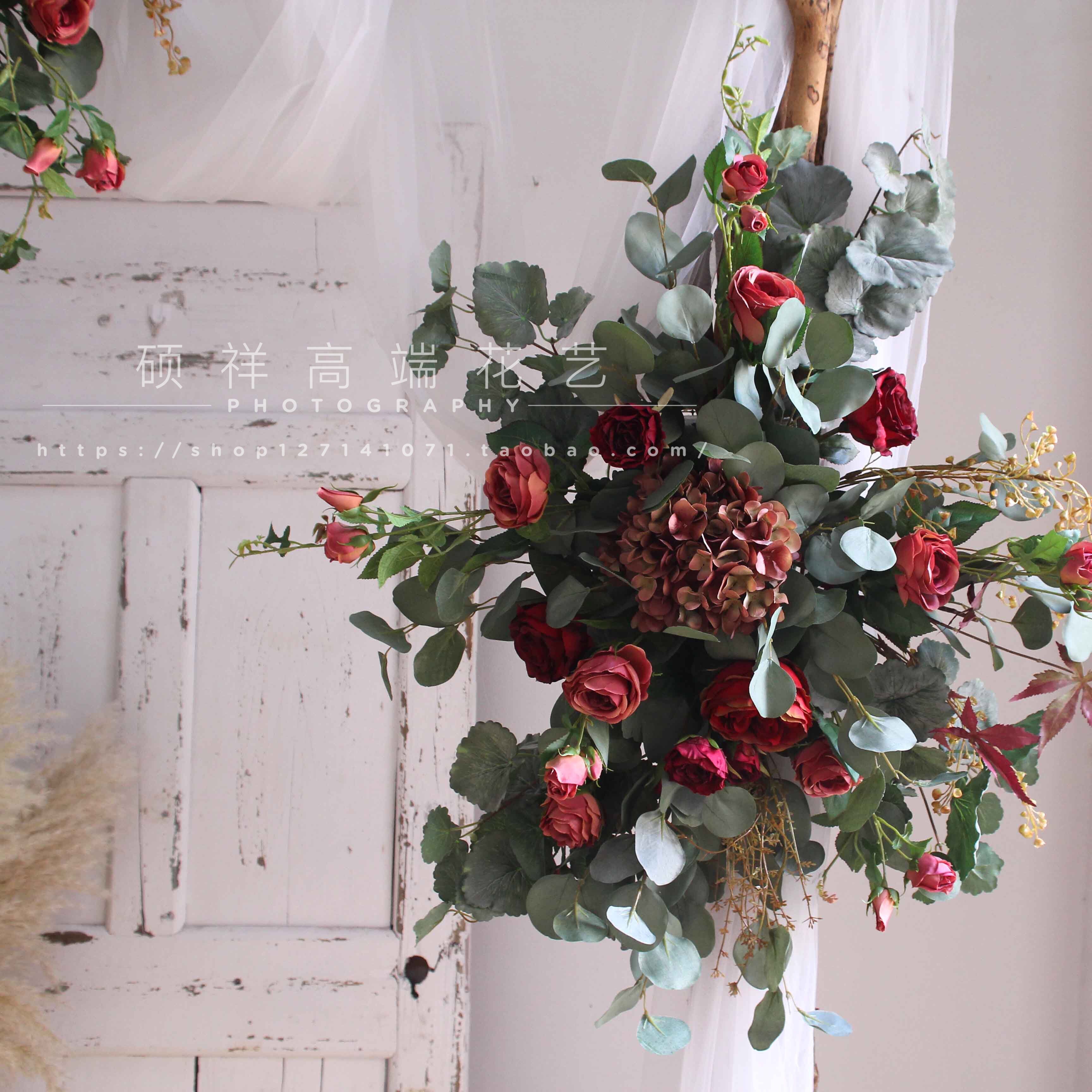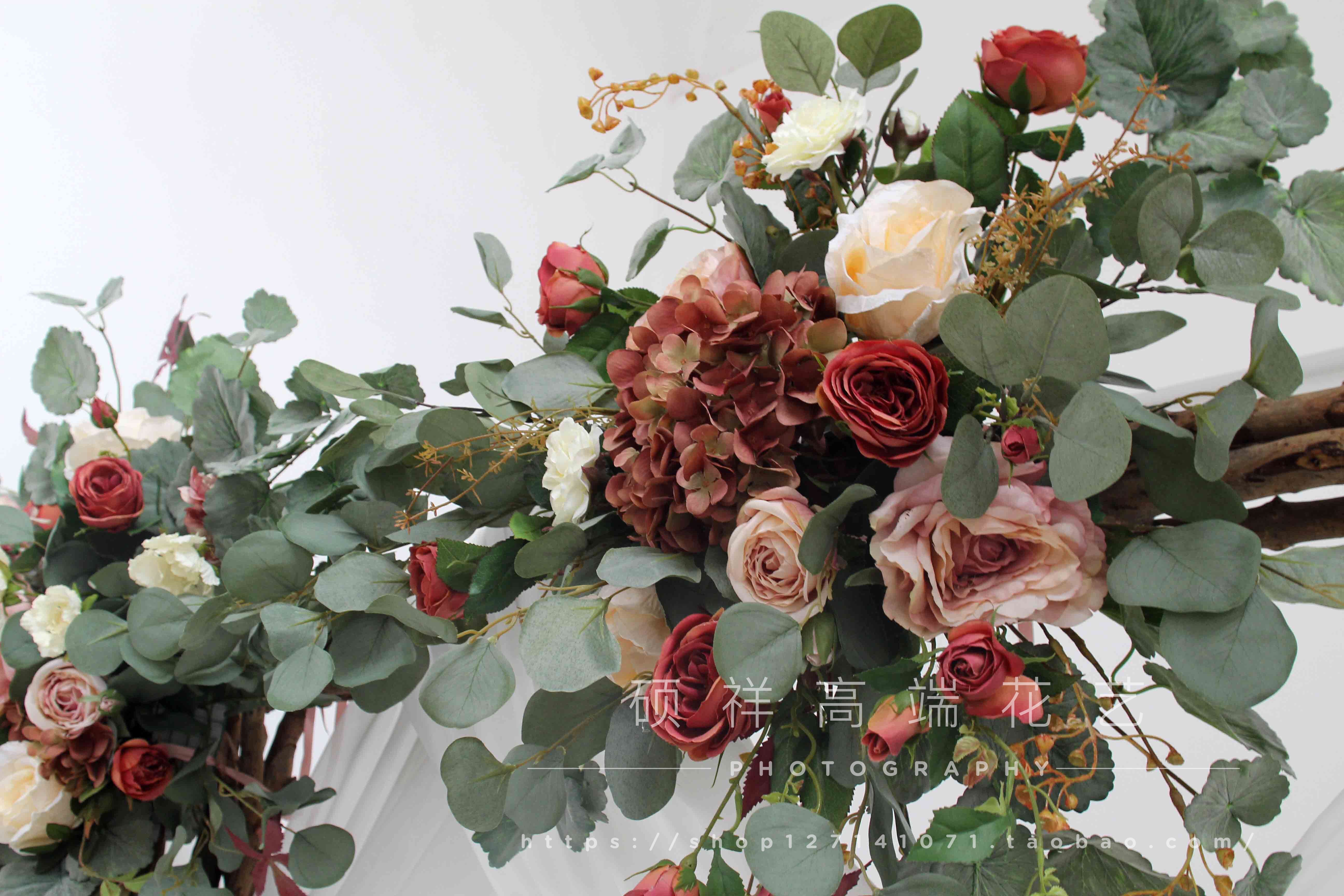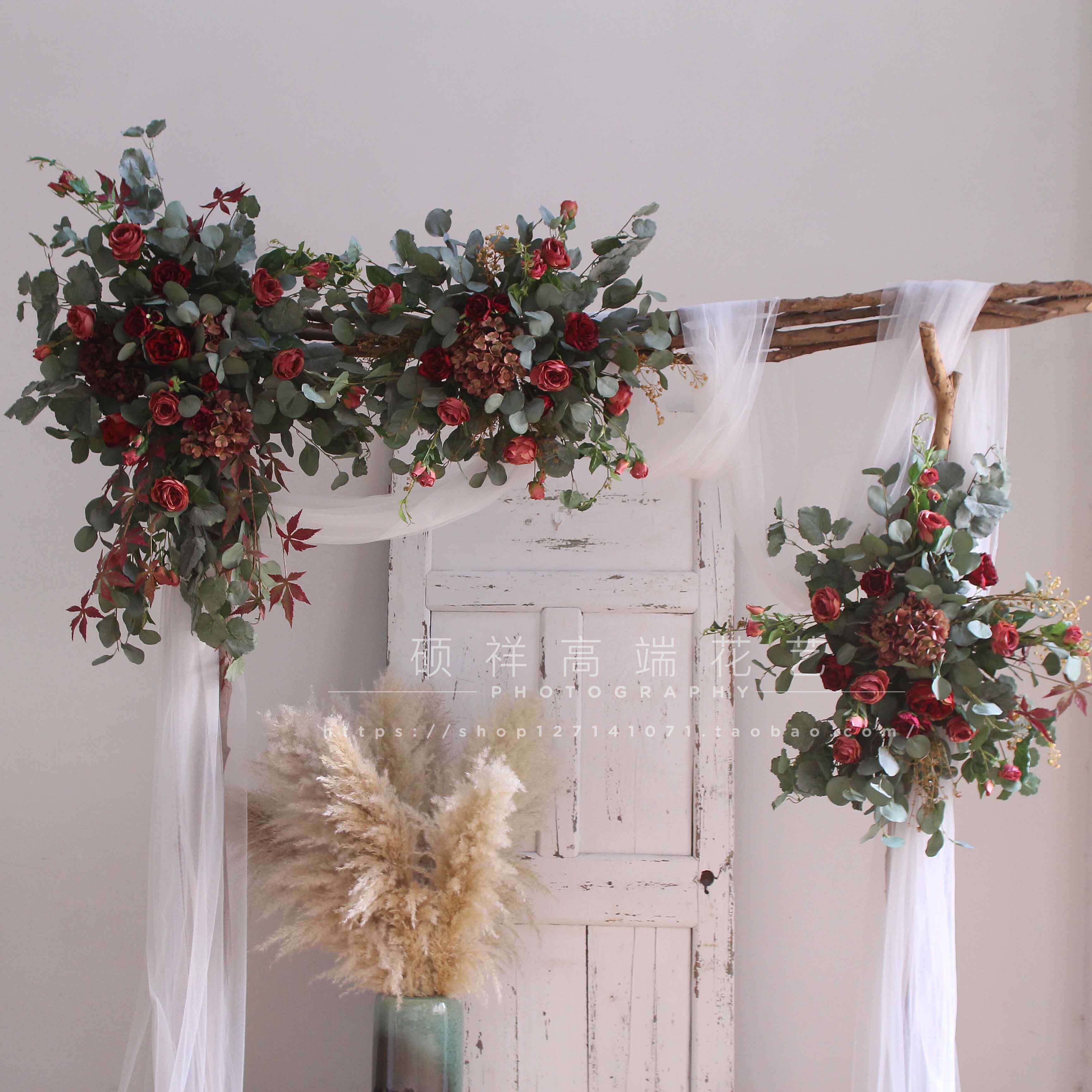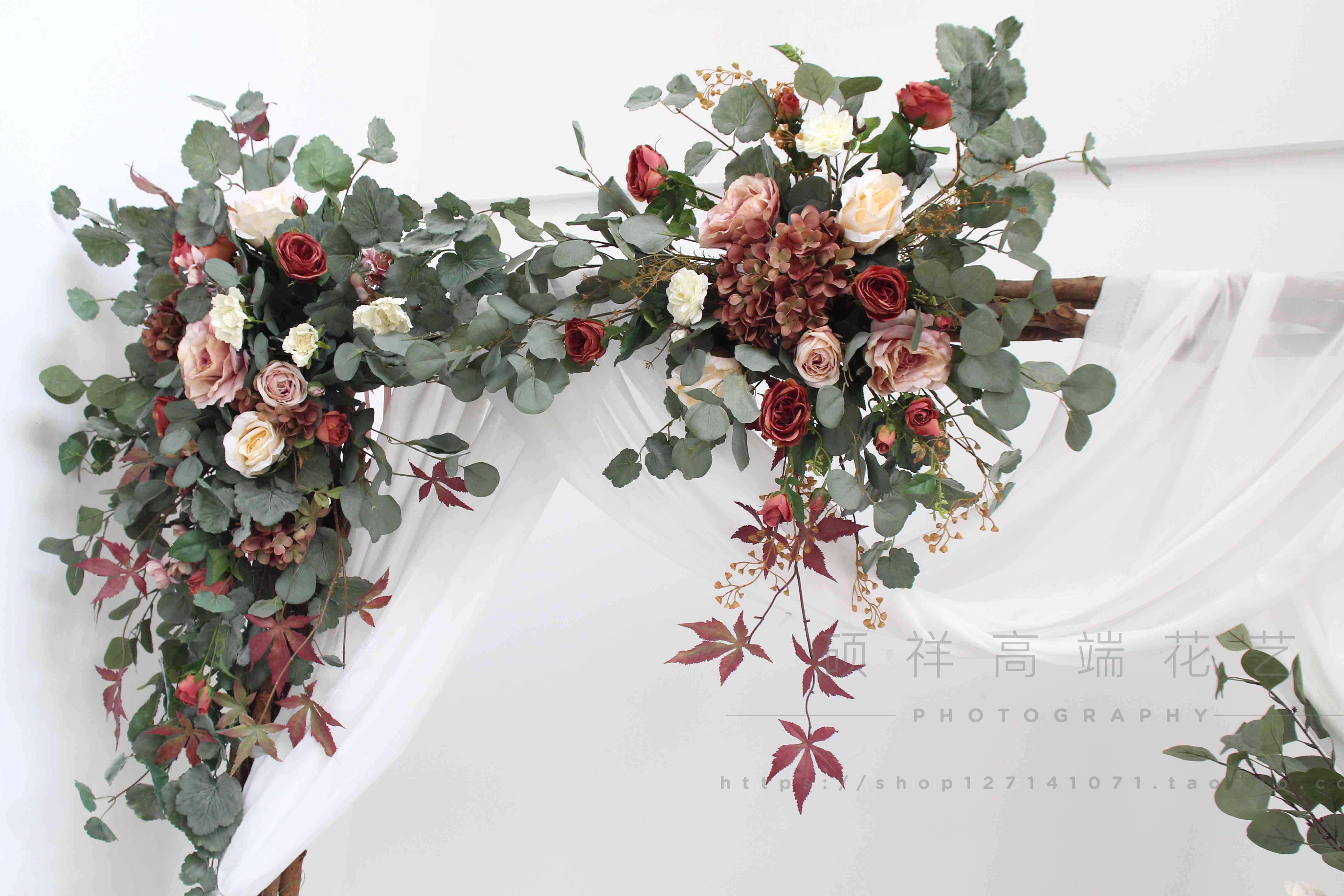 Design and color is the autumn red arch floral design and color is dark red red arch arch floral autumn flower art + wooden frame + red yarn arch floral + wooden frame + yarn